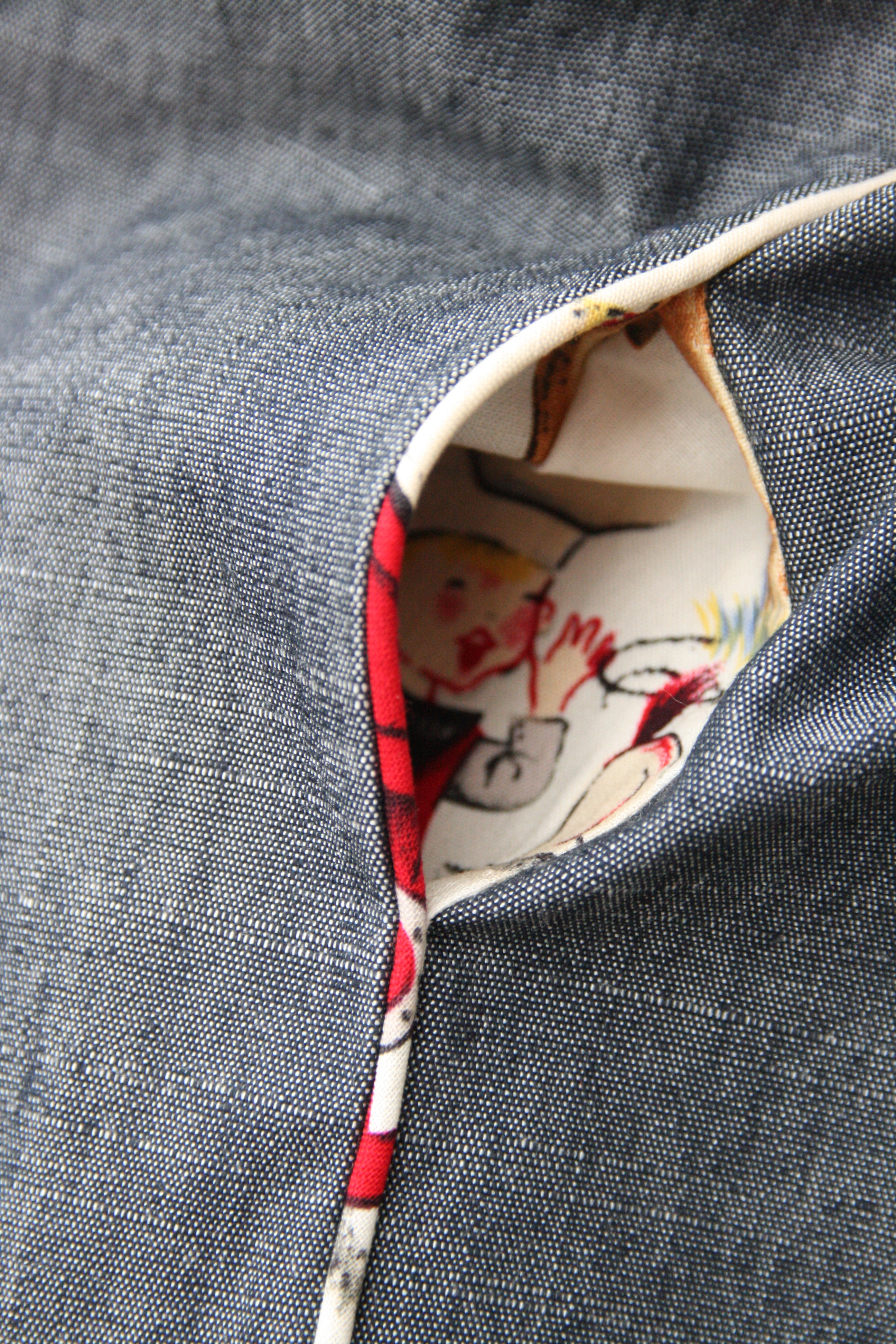De stof van de voering was de basis van het hele idee. Die moest gewoon alom aanwezig zijn. Daarom heb ik ze verwerkt in de paspel op het voor- en achterpand én in de zakken.