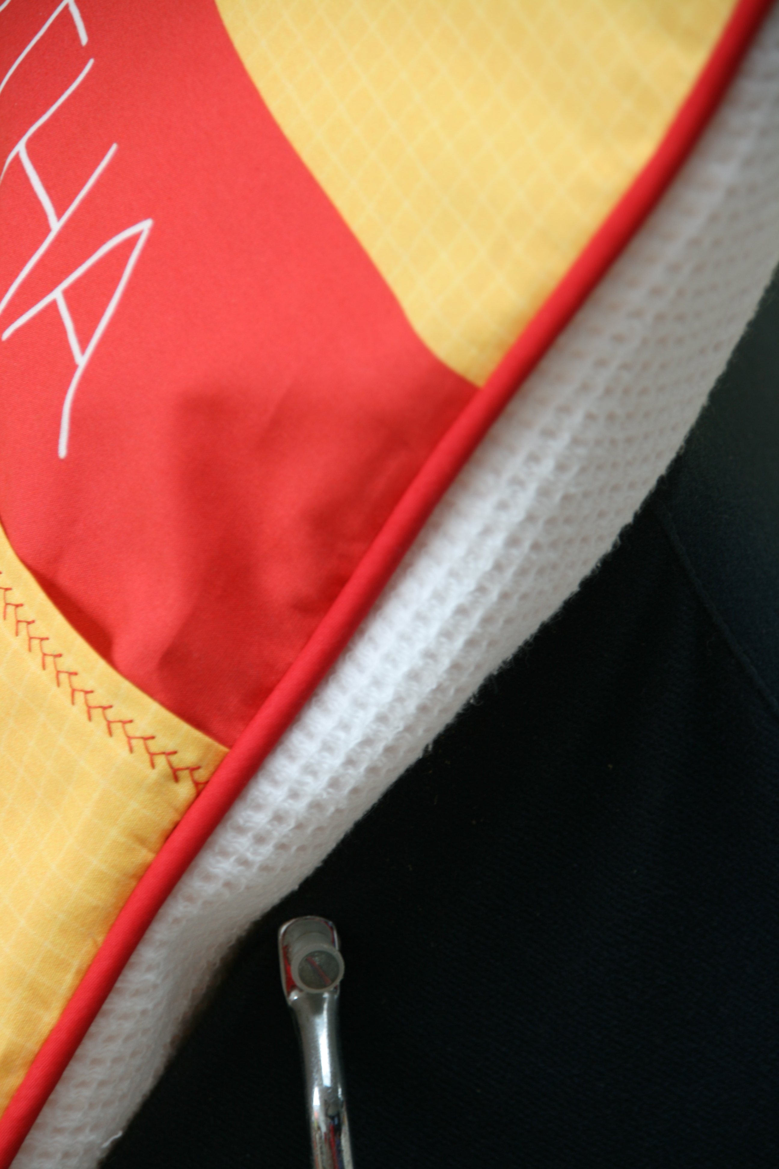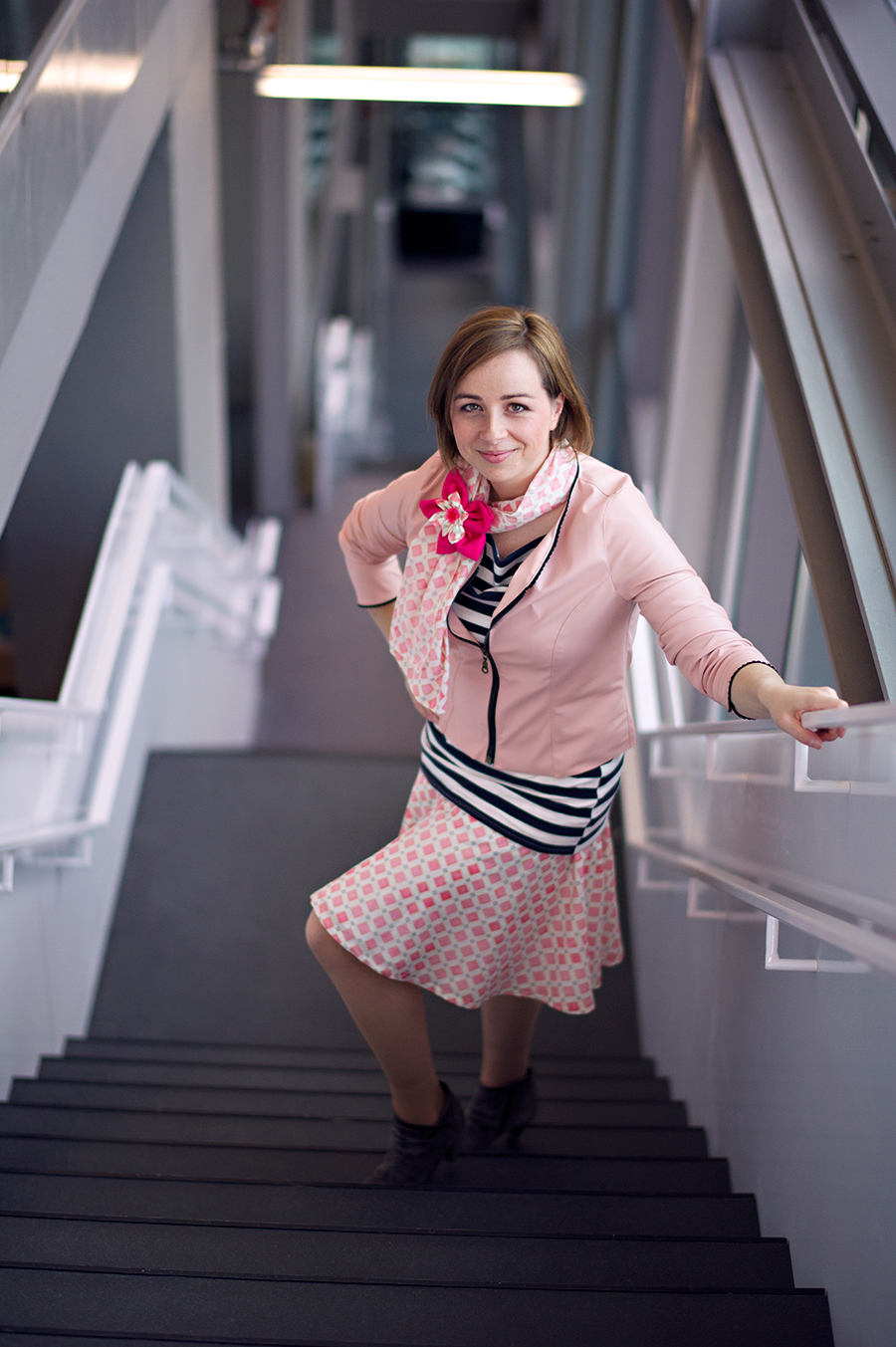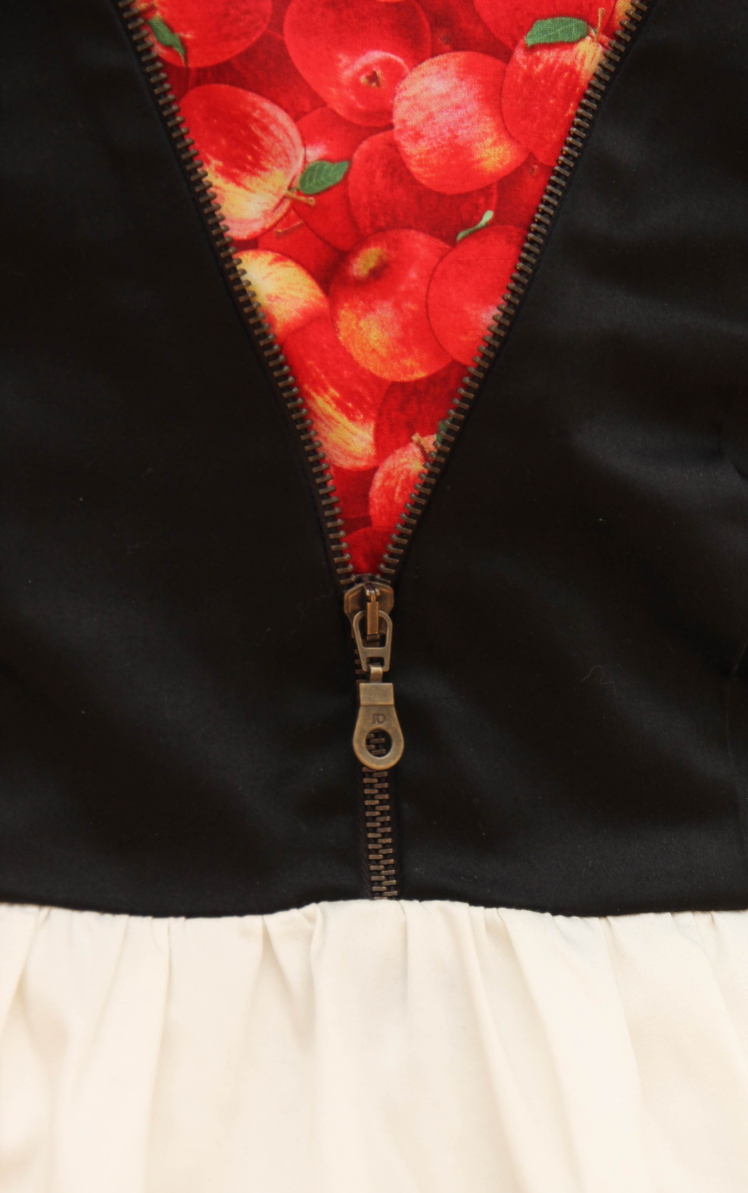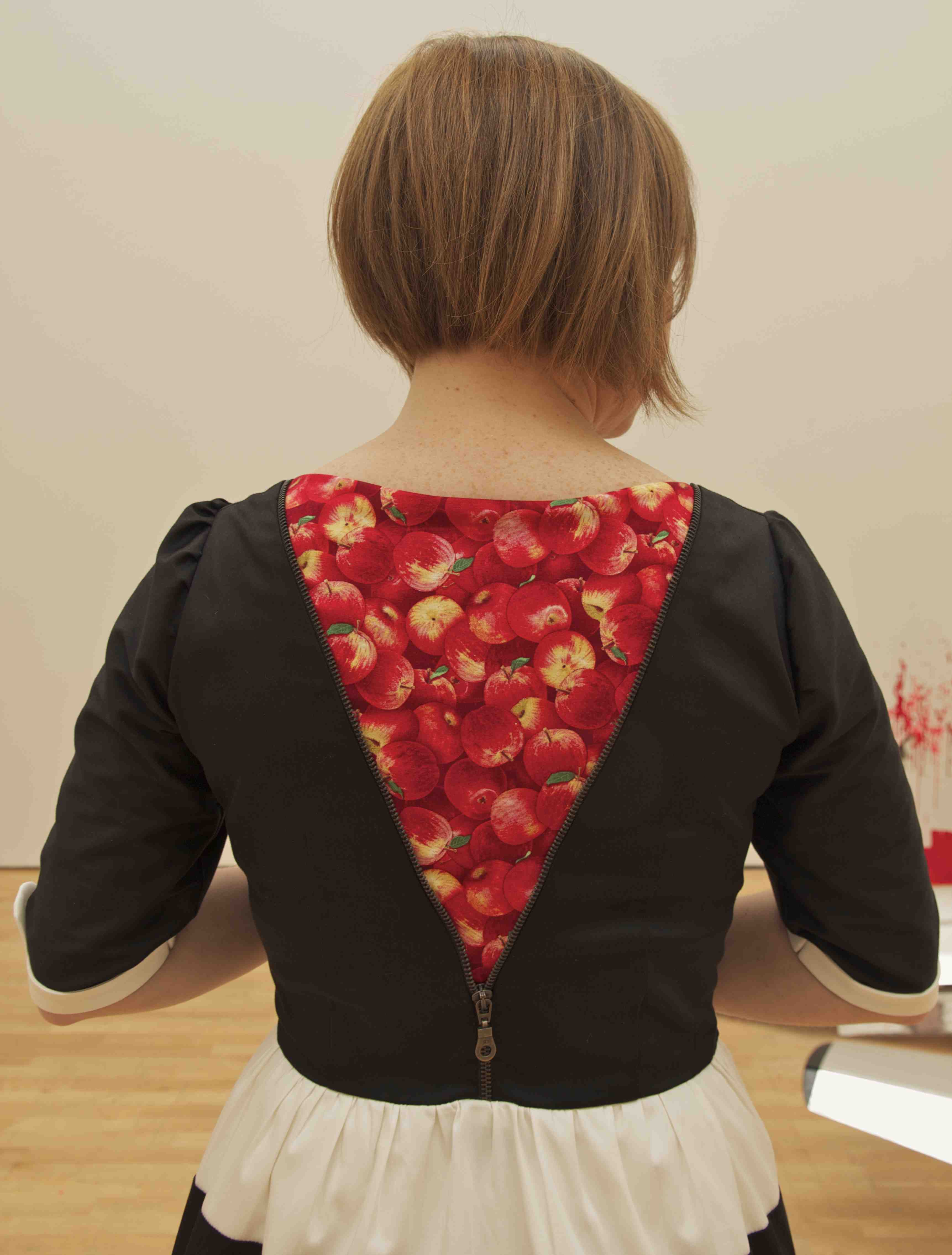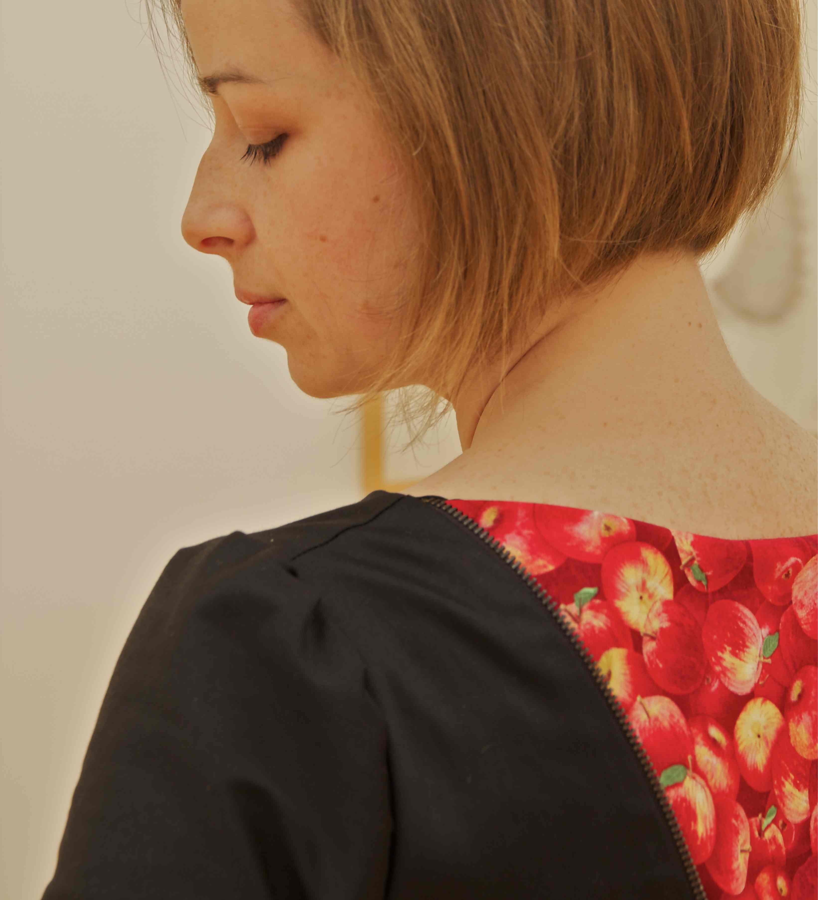 De verrassing komt wanneer ik me omdraai. In het rugpand verwerkte ik een rits die de illusie wekt dat de jurk opengemaakt is. Wat tevoorschijn komt is niet mijn blote rug, maar een heleboel rode appels. An apple a day…? Helaas, zo efficiënt waren die hier deze week dus niet 😉 .