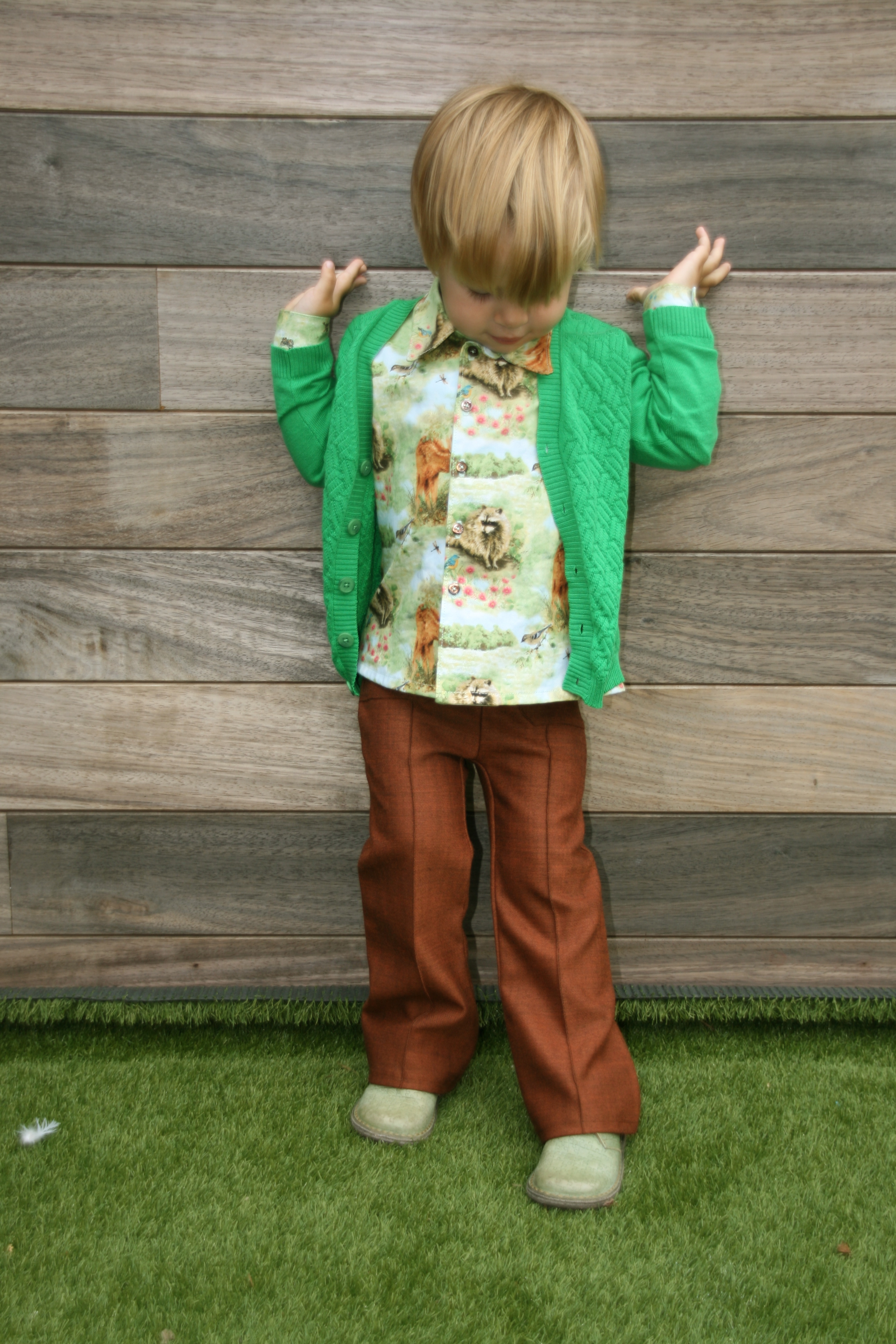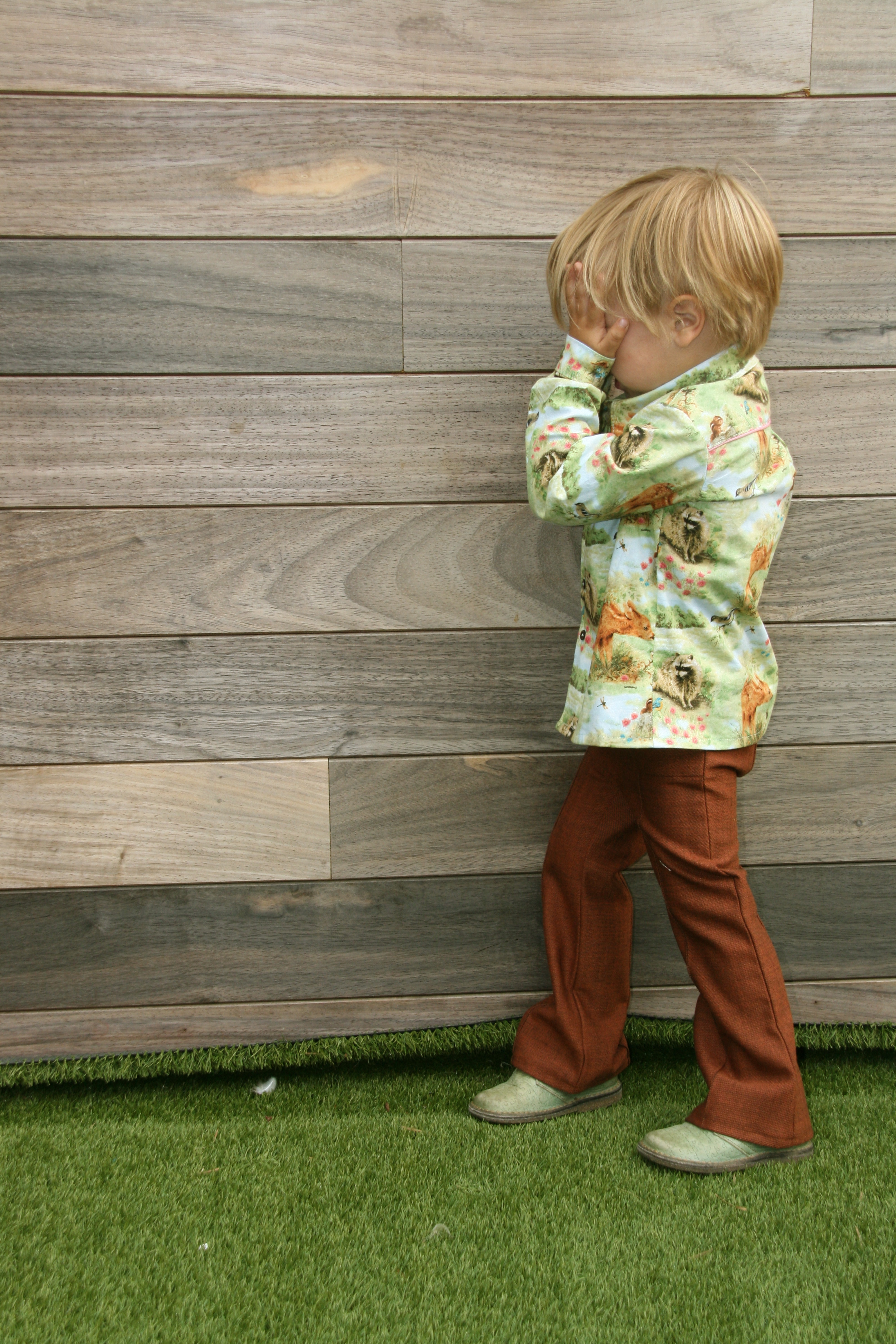 Ik ging van start met een Jacob broekje van Zonen 09. Again. Why change a winning team? Het staat hem zo goed, mijn slanke ventje. Ik maakte maat 92 voor mijn driejarige maar verlengde de broek 3cm. Zonder rits, ik wil liever geen sukkelende, prullende vingertjes wanneer de nood echt hoog is. De stof is een mix van wol en andere soorten, gevonden bij de Stoffenkamer in Gent (maar ik zie dat deze niet meer online staat). Er zit wat rek in en hij voelt ontzettend comfortabel en zacht.