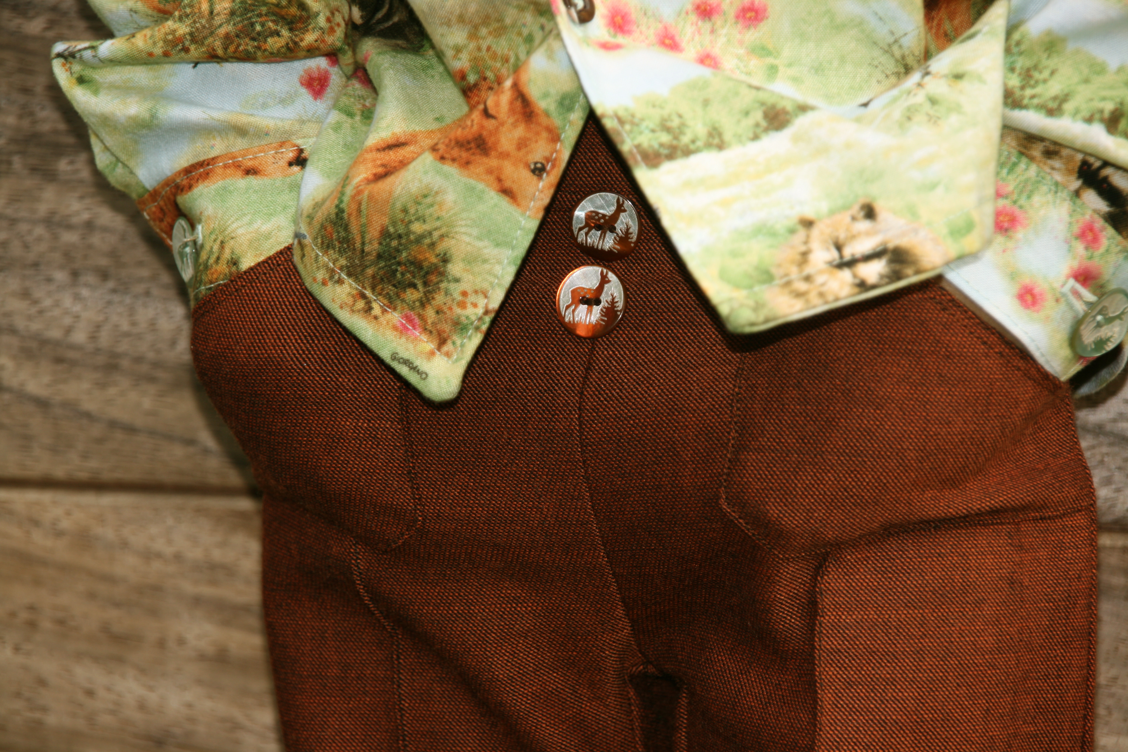 Parelmoeren knoopjes met een hertje op. In mintgroen voor het hemd en donkerbruin voor de broek. Het zit hem soms in de details.