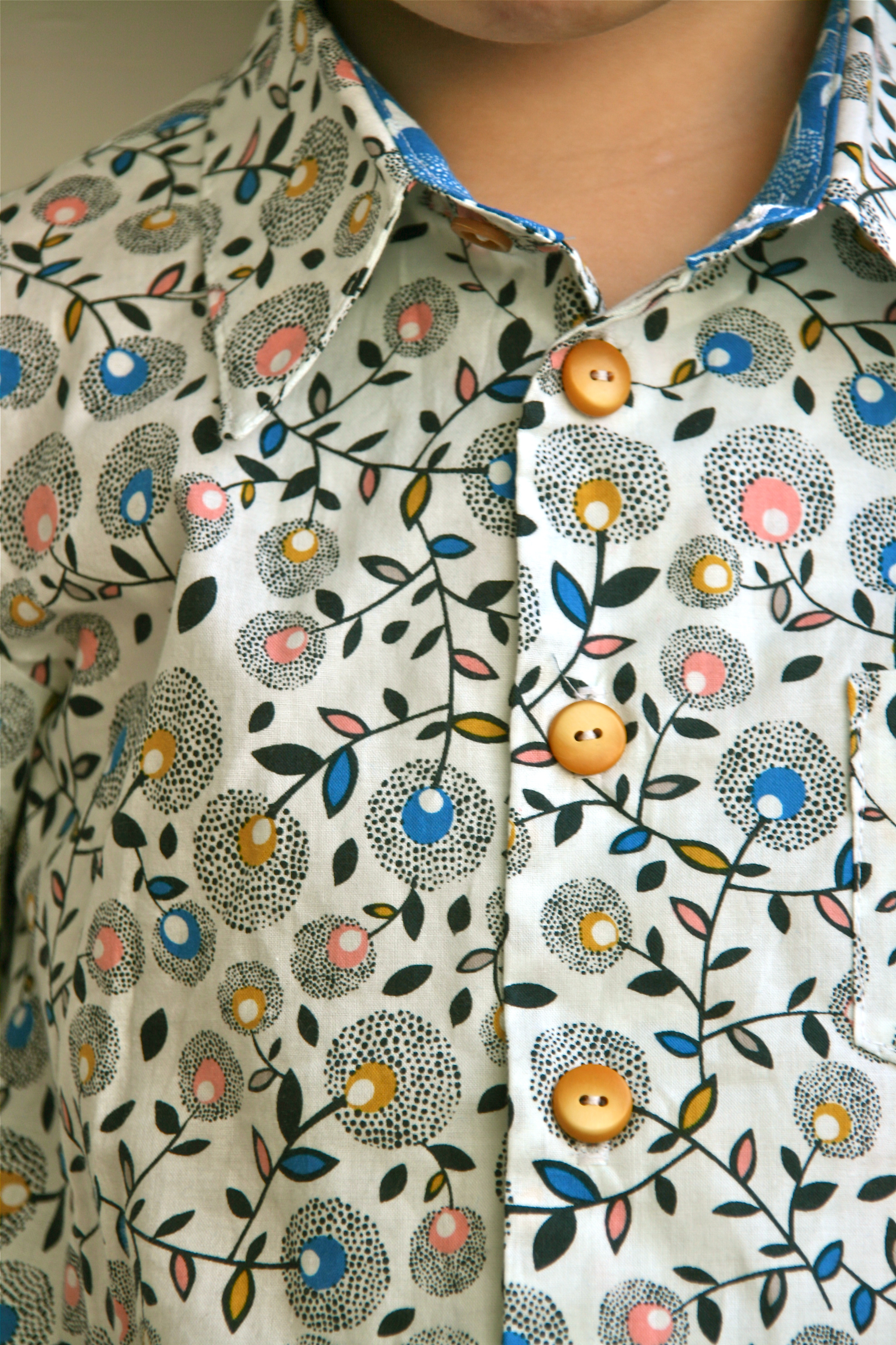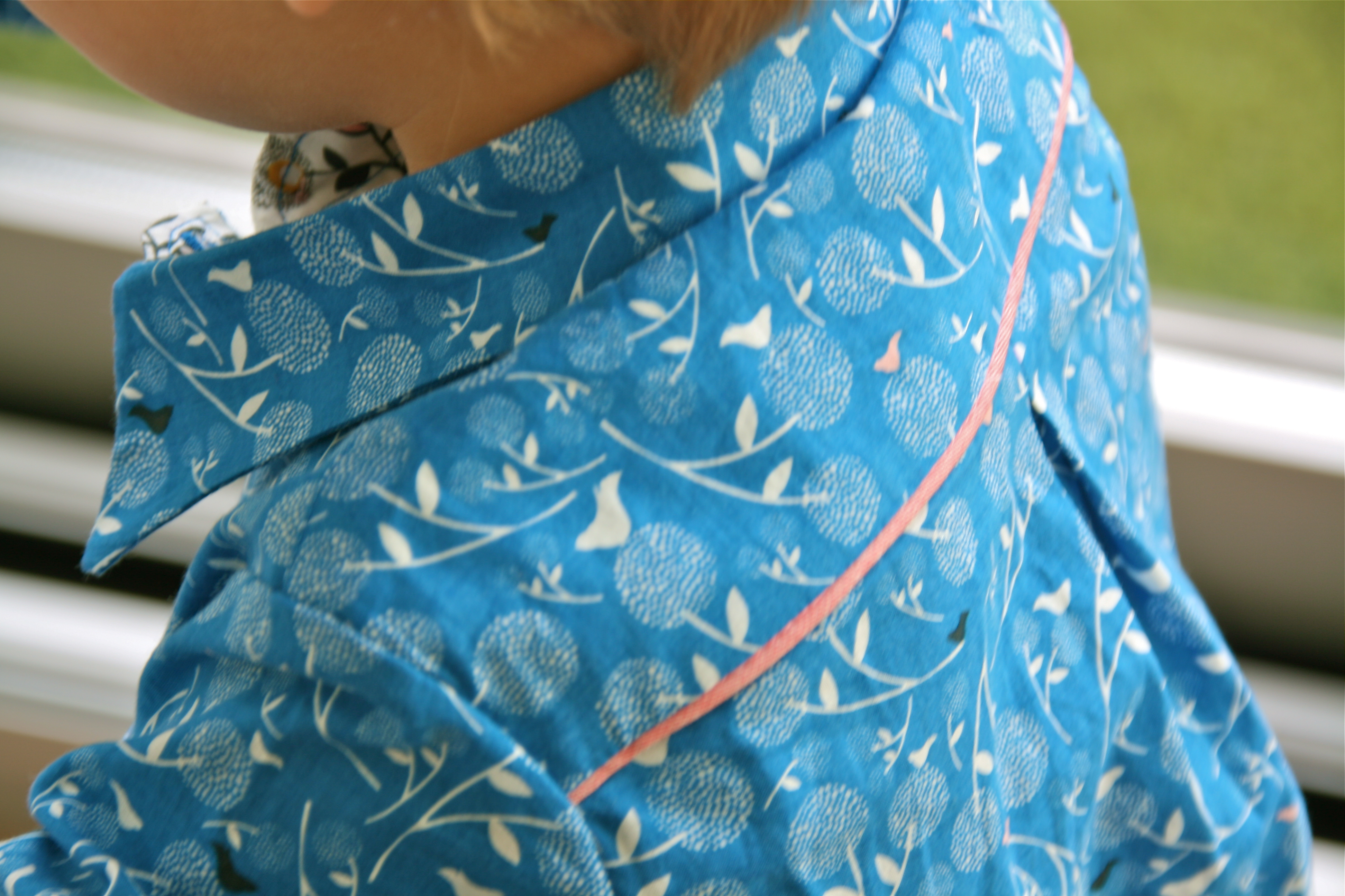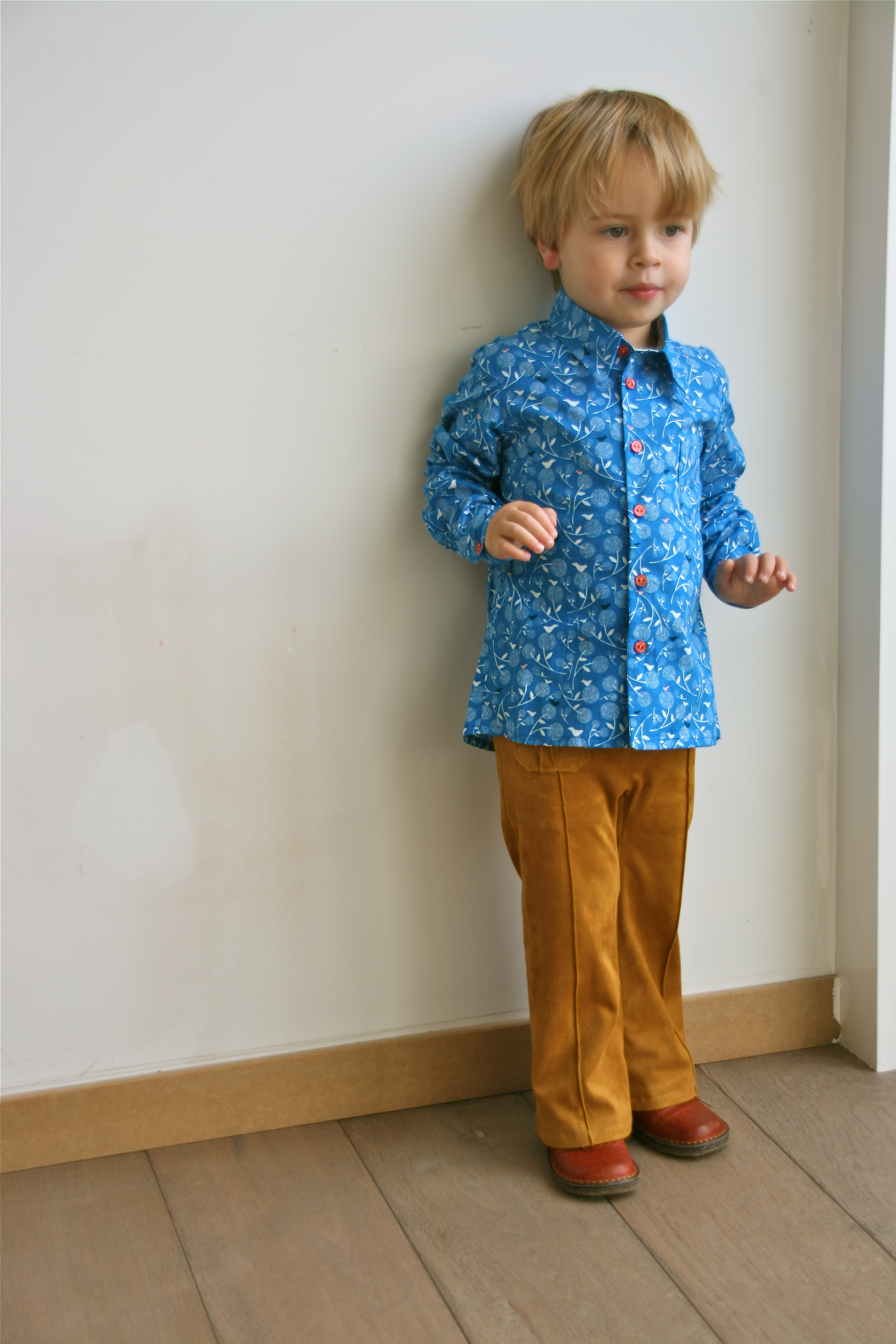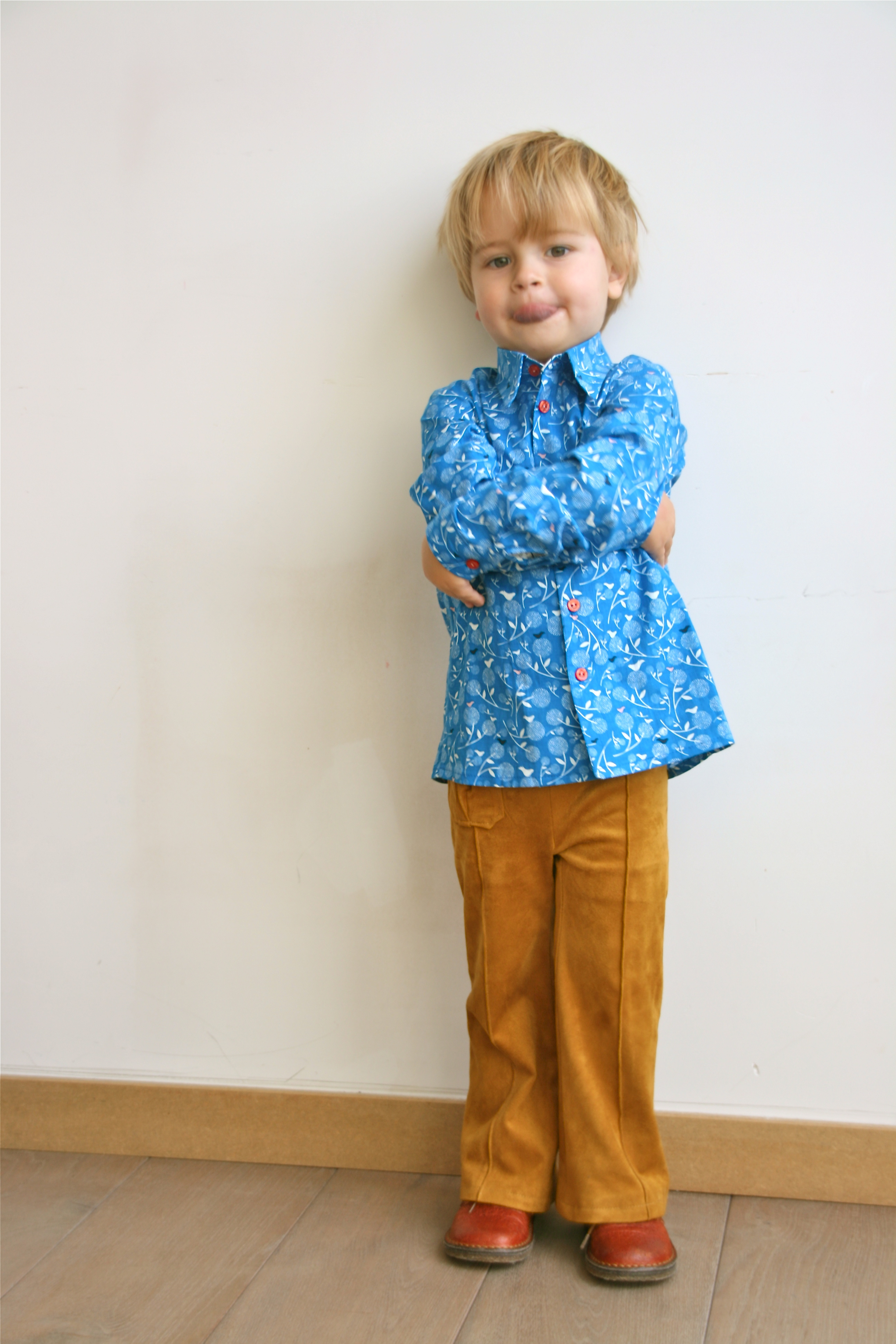 Deze keer heb ik wel gezondigd tegen mijn eigen regel niet op de groei te maken (kopen). Hier heeft dat geen enkel nut, ik heb in het verleden maar al te vaak kledij gekocht die uiteindelijk in het verkeerde seizoen bleek te passen. Wat het hemd betreft, nam ik voor de 3 jarige zoon maat 110 small. De mouwen zijn bijgevolg veel te lang en het geheel nog steeds wat te breed. Maar het gaat. En wat nog het beste is, ik nam niet de gewone katoenvariant van de stof, maar de voile. Doordragen in de zomer is dus geen enkel probleem. De prachtige stof komt van bij Bellelien. De rugpas, binnenste staander van de kraag en de mouwsplitbiesjes heb ik verwisseld tussen beide hemdjes.