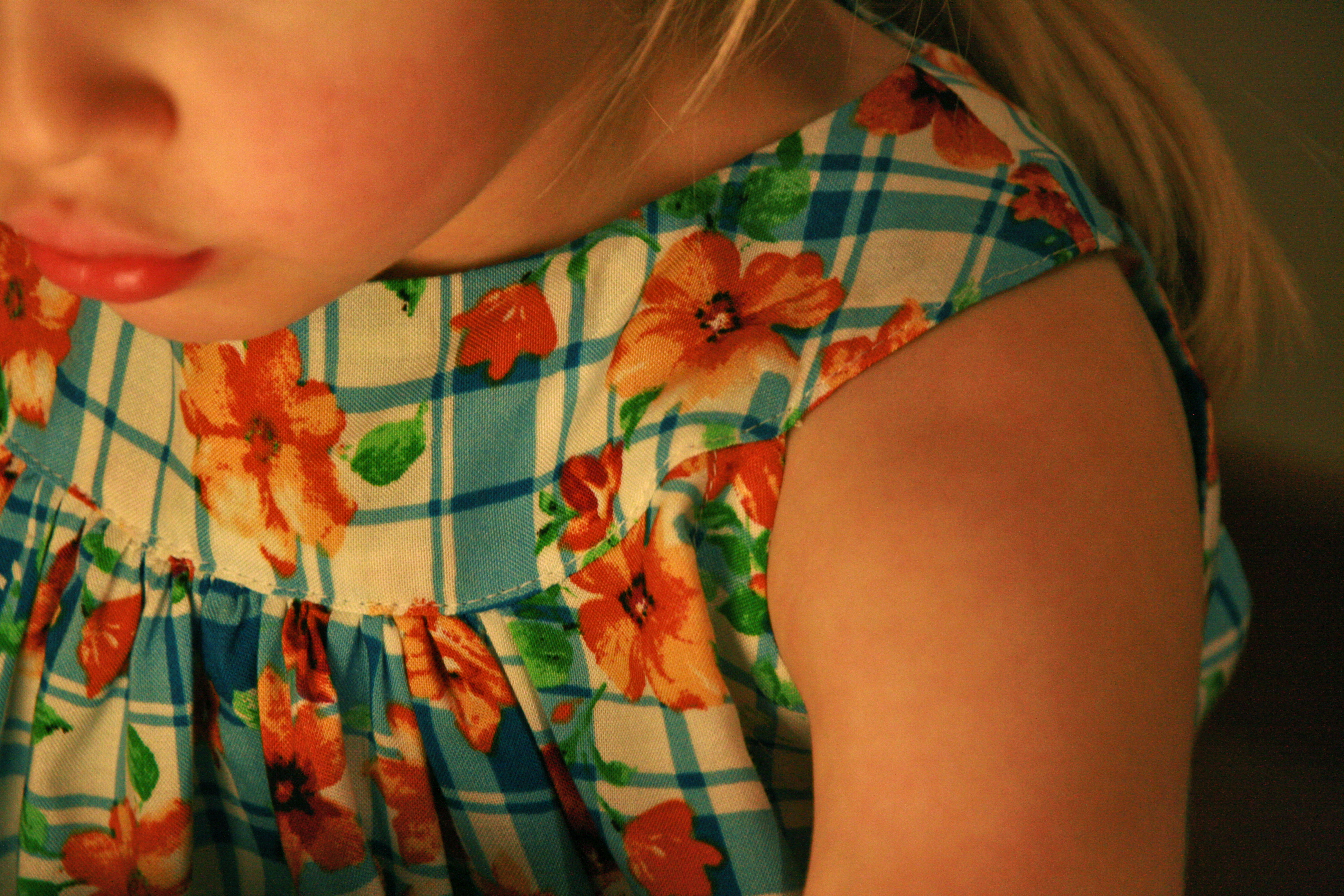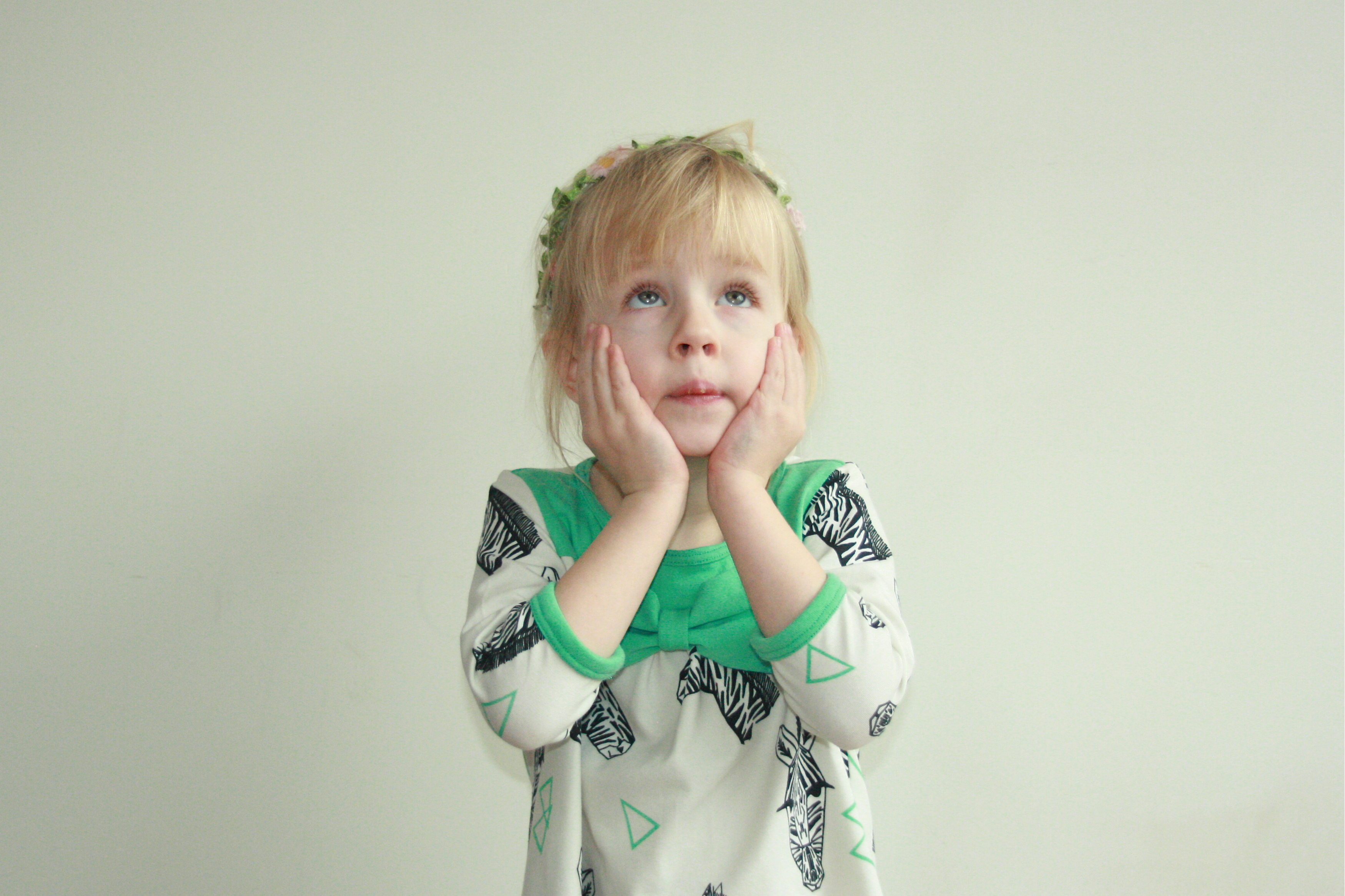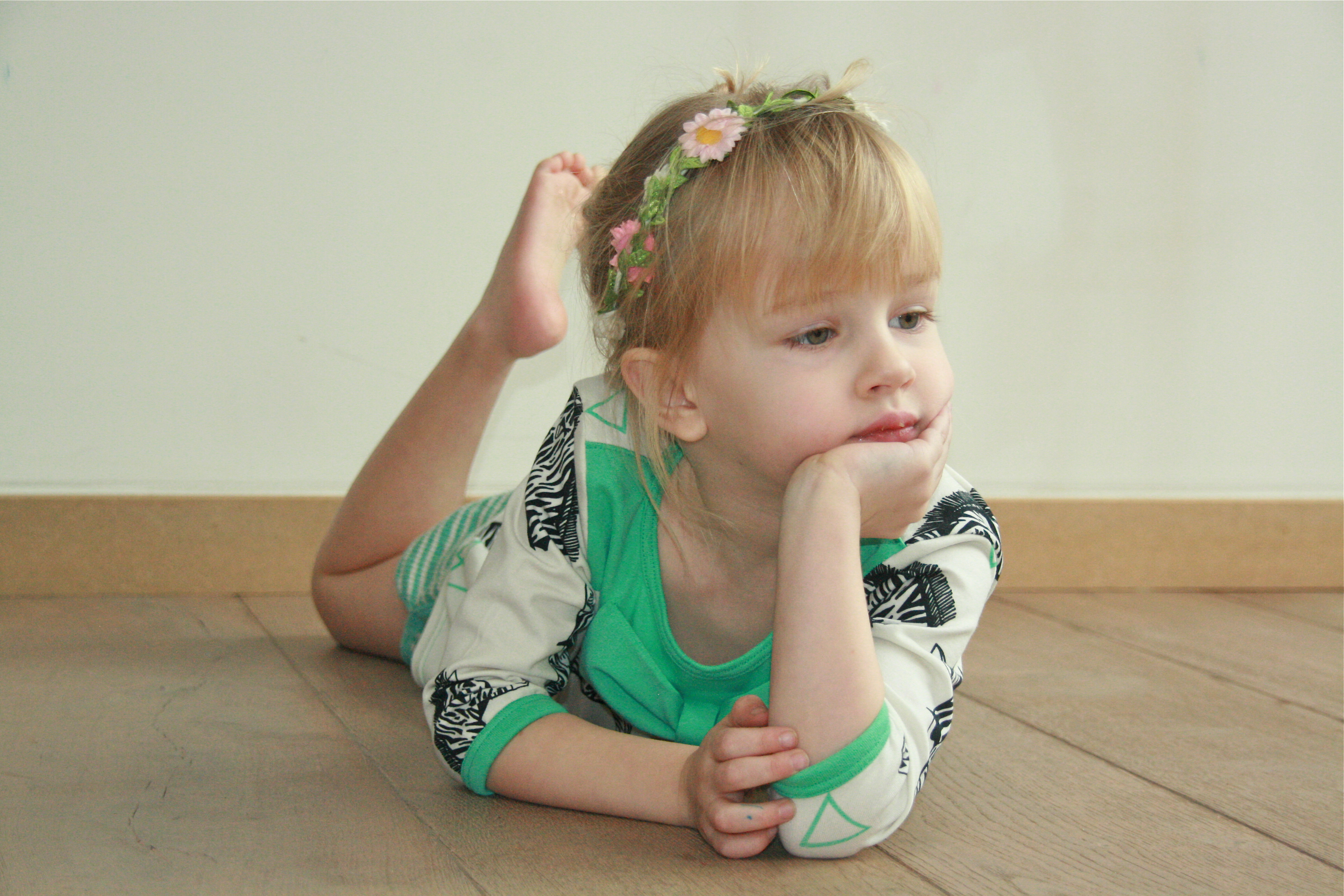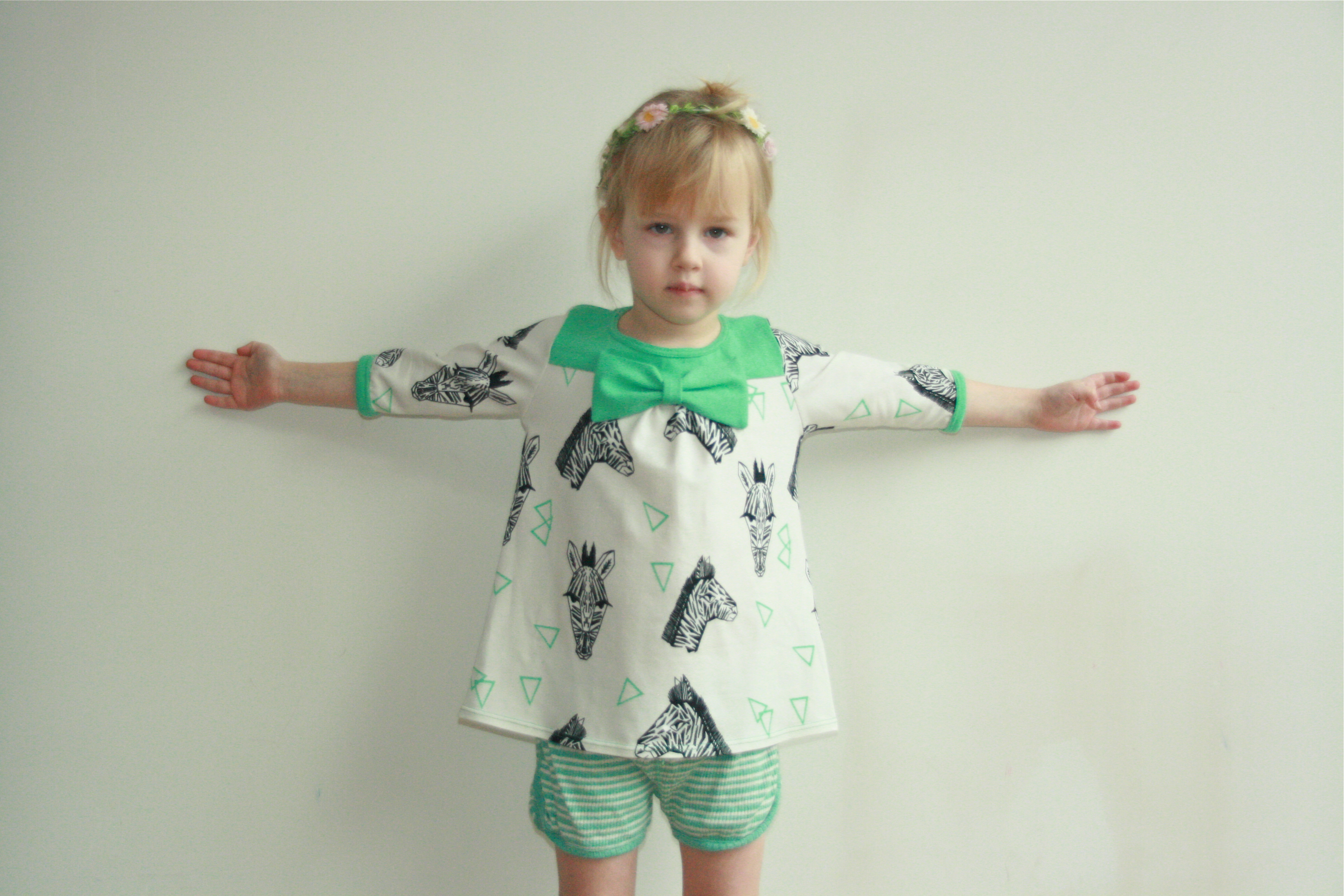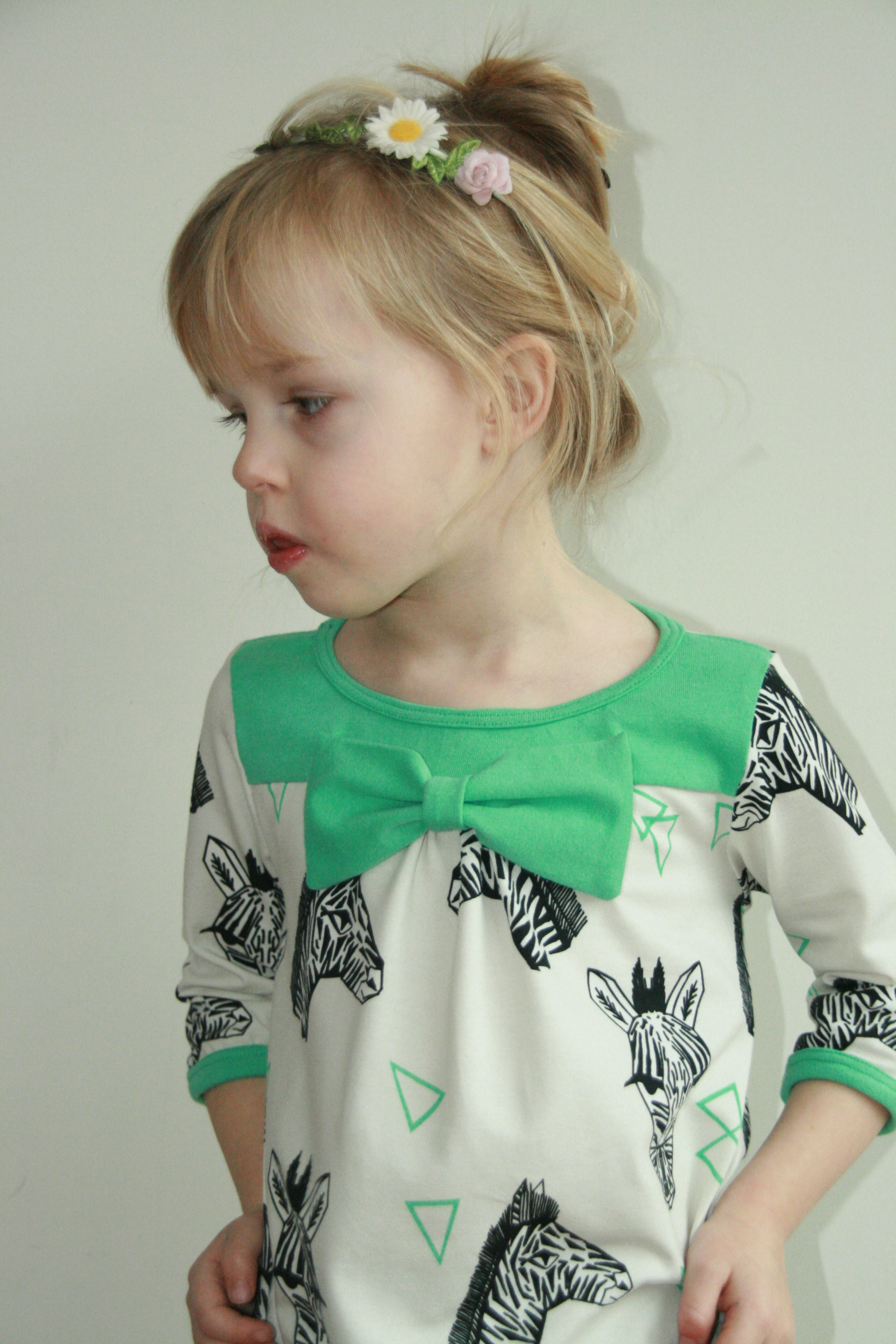 Ik had mooie tricot gekocht bij Chellebel, van de ontwerpster Andrea Lauren (medeblogsters weten wel wie dit is, vermoed ik). Helemaal de trend van nu, de combinatie zwart-wit. Maar voor hier mag er wel een kleuraccentje in. Het patroon komt uit de Ottobre 2012/4, maar kreeg wel enkele aanpassingen. Zo werden de mouwen verkort tot net onder de elleboog en onderaan voorziet het oorspronkelijke patroon een afwerking met smock. Die heb ik weggelaten omdat ik er niet van hou als er teveel gaande is, naast de print en de opvallende strik.