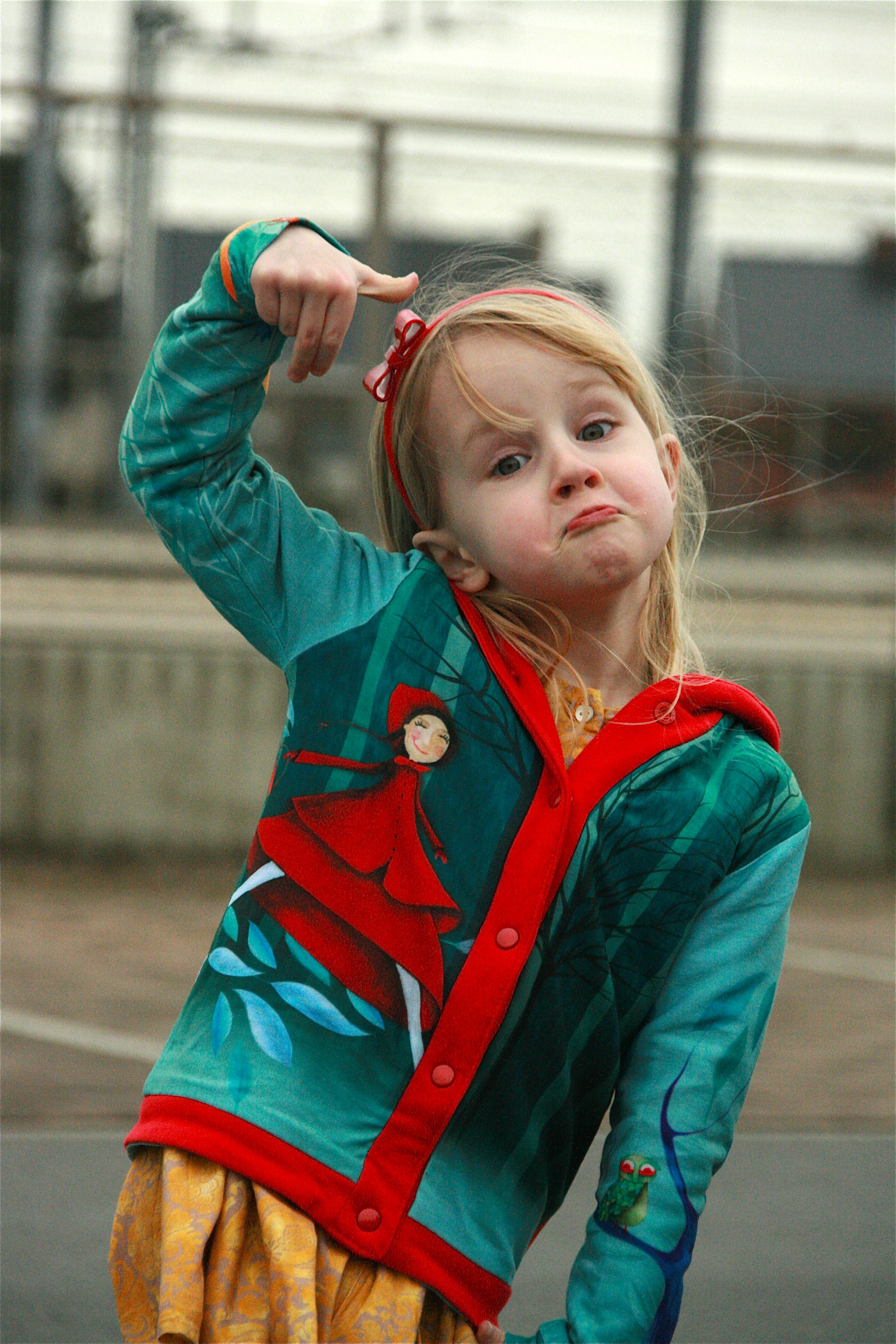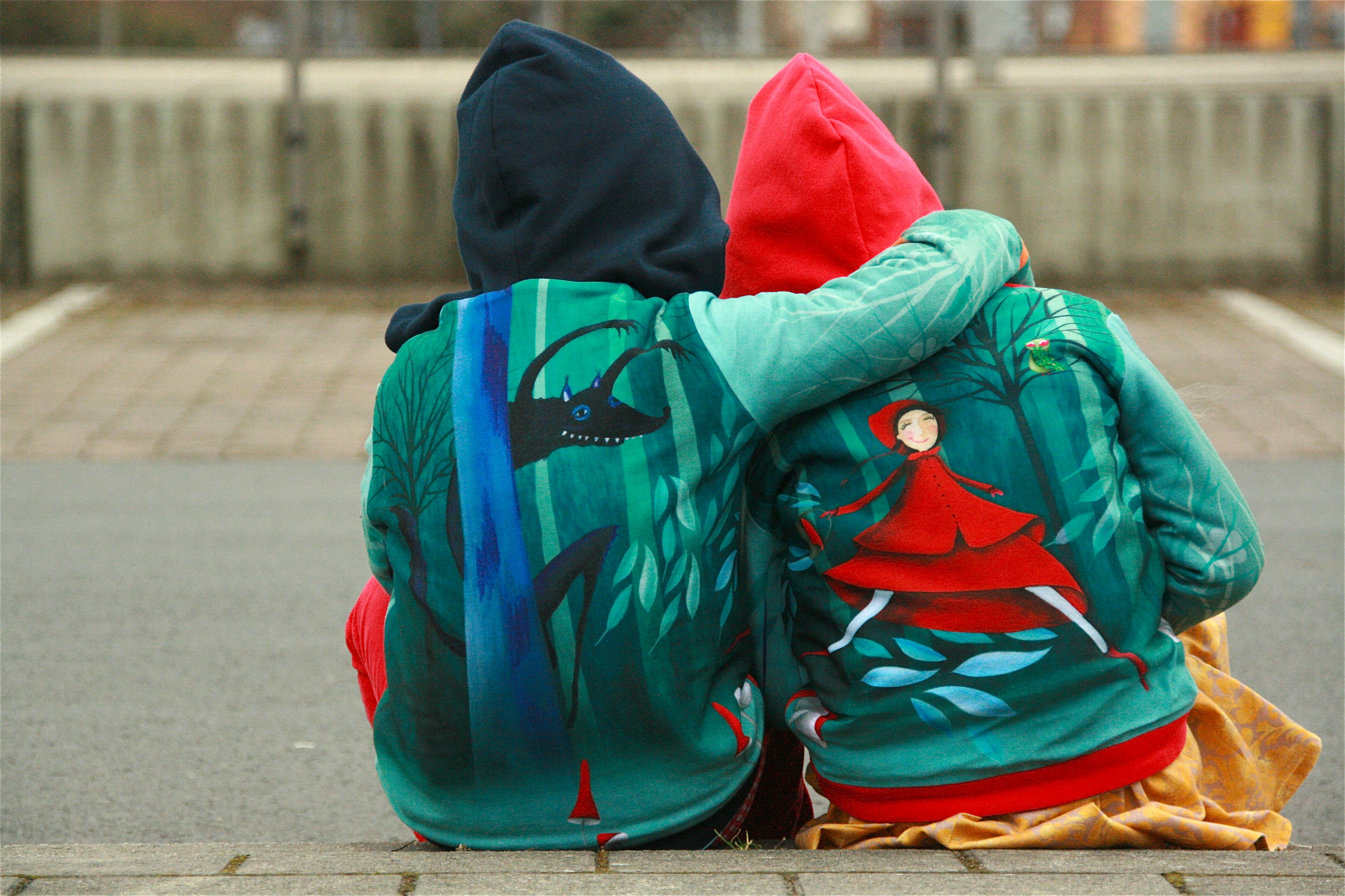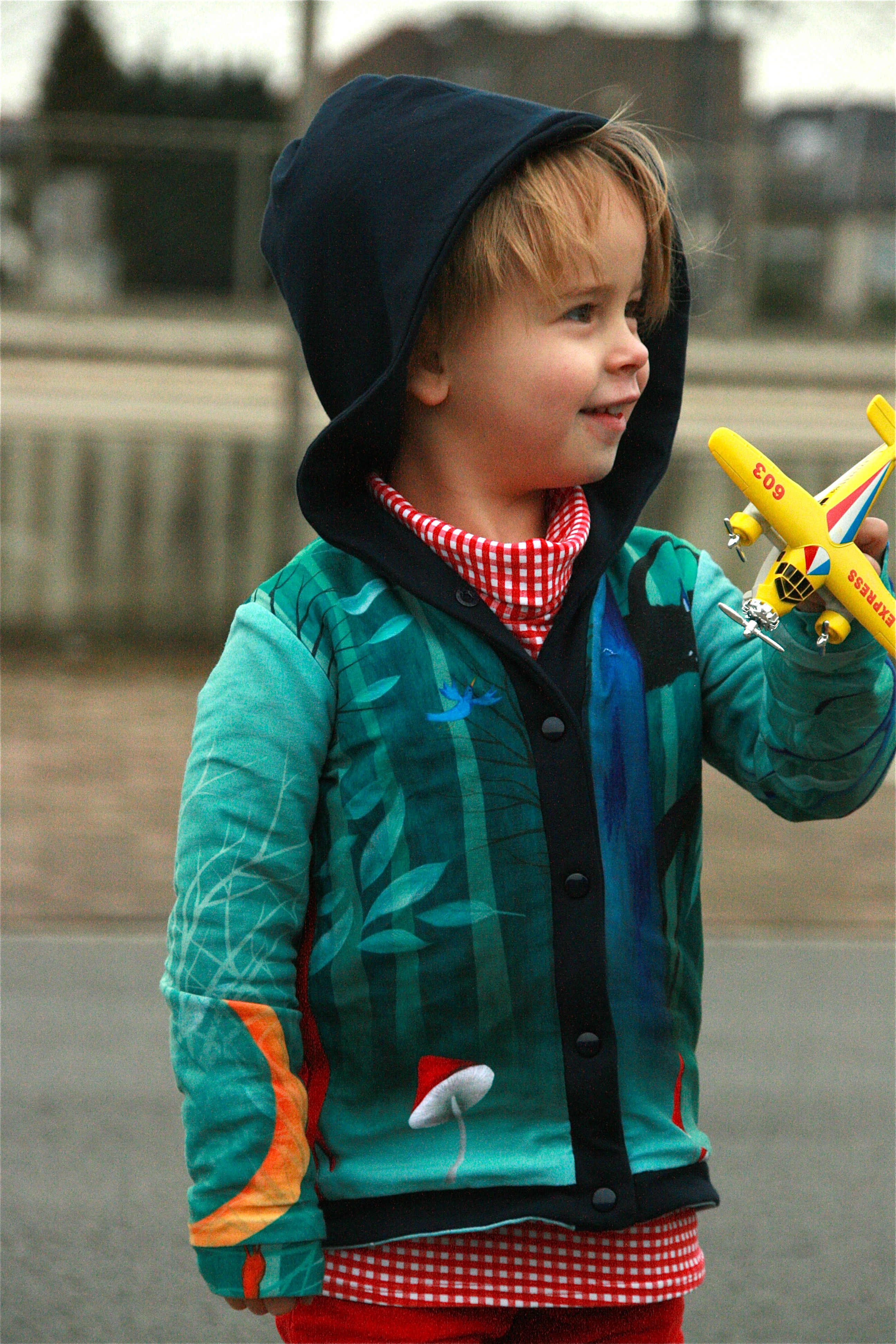 De Ole is een omkeerbare trui. De vorige keer maakte ik al eens gebruik van een mooie, digitale print voor de andere zijde. Trouw als ik ben aan mijn eigen ‘speelse’ stijl (dixit de man des huizes), deed ik opnieuw beroep op Ella&Basiel voor een mooi lapje (eigenlijk 2) tricot. Thema: Roodkapje en de Boze Wolf. Echt elke cm van beide panelen werd gebruikt. Het onderschrift “Même pas peur du méchant loup” werd gebruikt als onderste boord wanneer de trui gedragen wordt met de sweaterstof aan de buitenkant. Ook voor de polsboorden werd de tricot gebruikt. De kap en sluitrand vooraan werden volledig uit de sweaterstof geknipt.