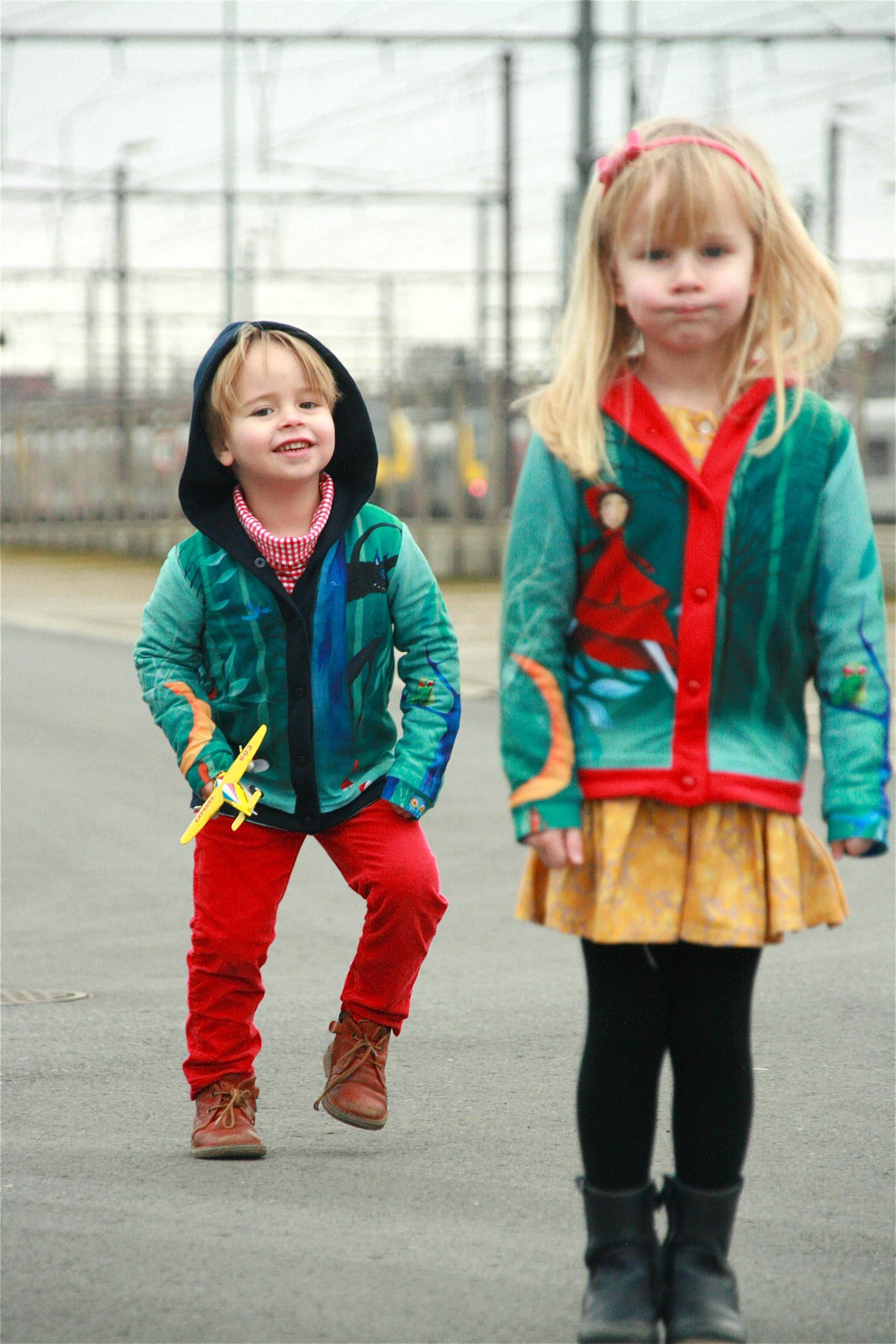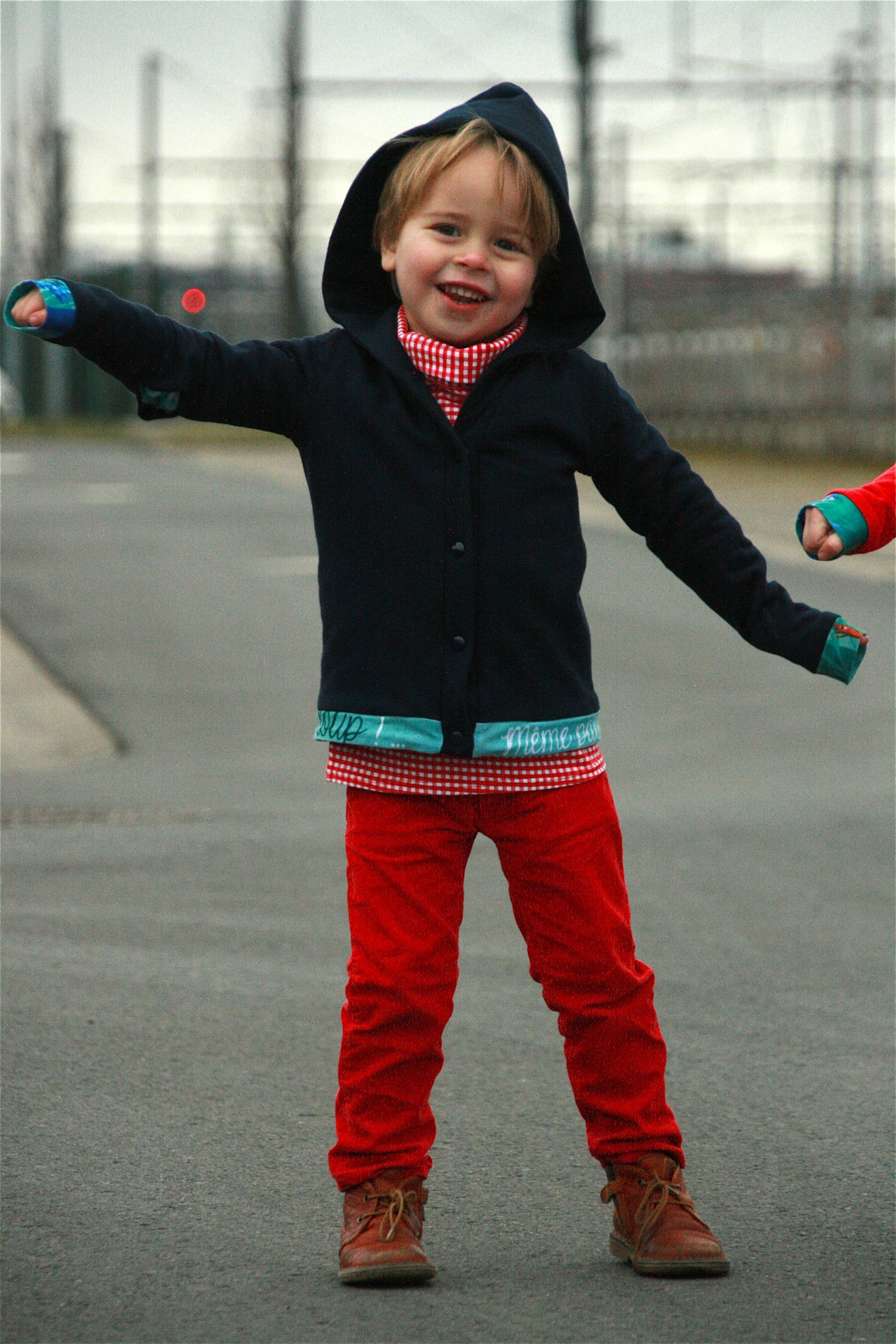Ik maakte nog eens gebruik van een patroon van Zonen09, de Ole. In tweevoud, voor broer en zus. Beide zitten ondertussen in dezelfde kledingmaat, zijnde 104, gemakkelijk voor mij. Dat lag hier immers al geknipt van de vorige versie. Rode sweaterstof voor de dame en donkerblauwe voor de heer. Met kap uiteraard. Beide truien sluiten met metalen kamsnaps in dezelfde kleur als de sweaterstof, een echte toevalstreffer dat ik deze vond!