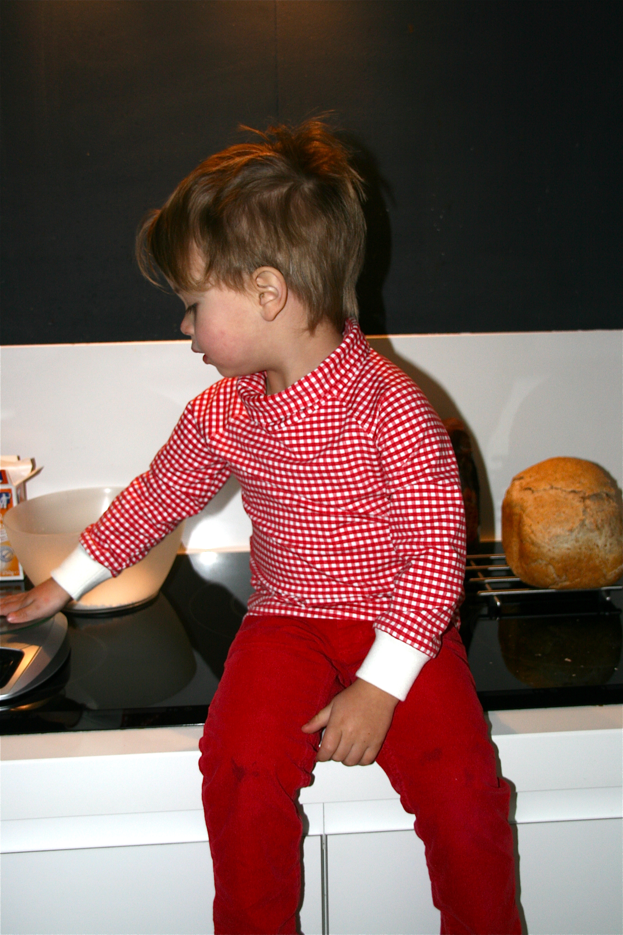 Verder heb ik hier niet veel aan toe te voegen, er werden geen wijzigingen aan het patroon aangebracht, er werd niets extra gevoerd of verstevigd. Enkel dit, ik maakte nog snel een colltruitje voor de zoon erbij in tricot met rode vichy ruitjes. Een raglan-model met witte boordstof aan de mouwen maar mét colletje. Een snel klaar probeerseltje.