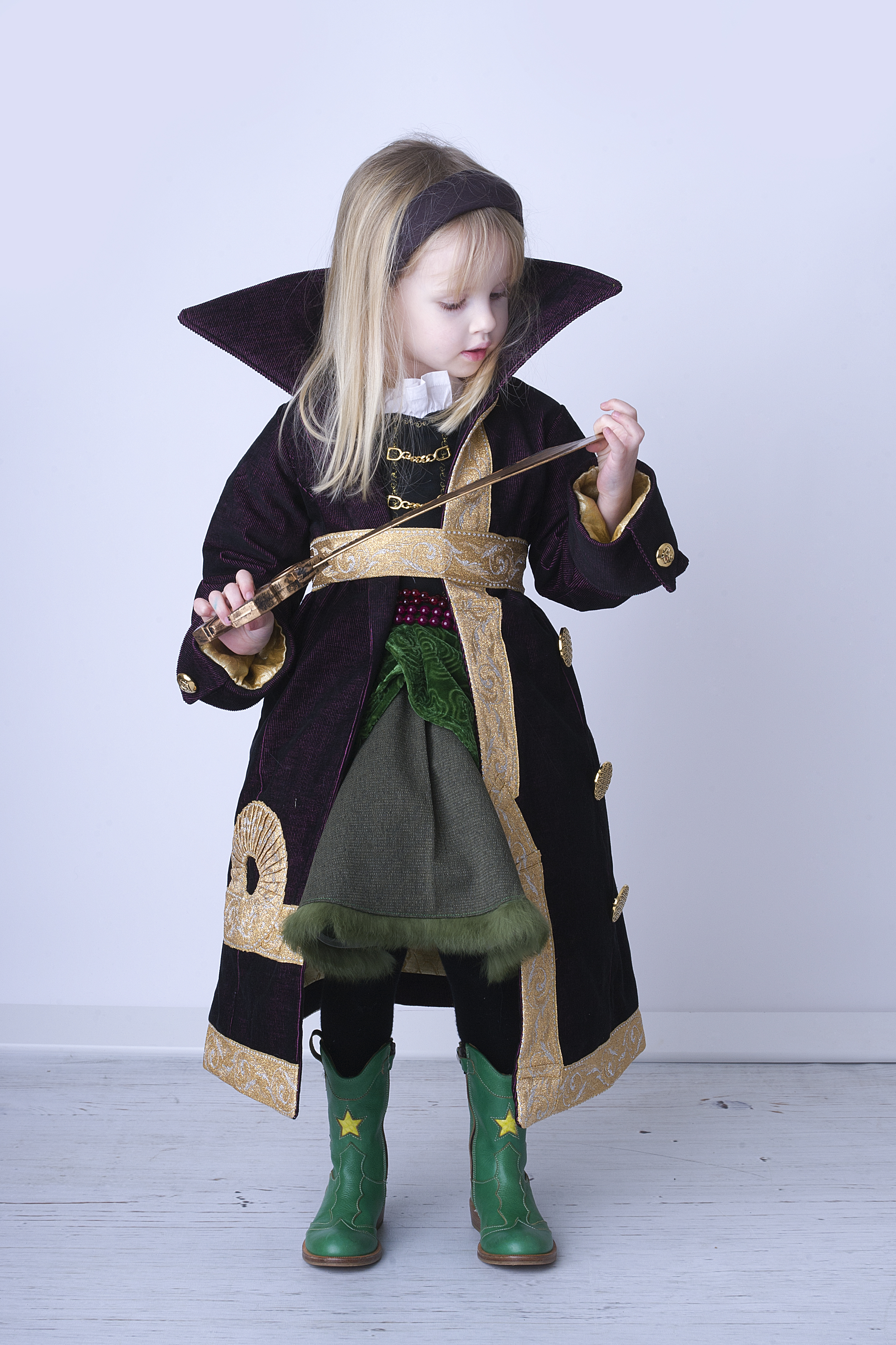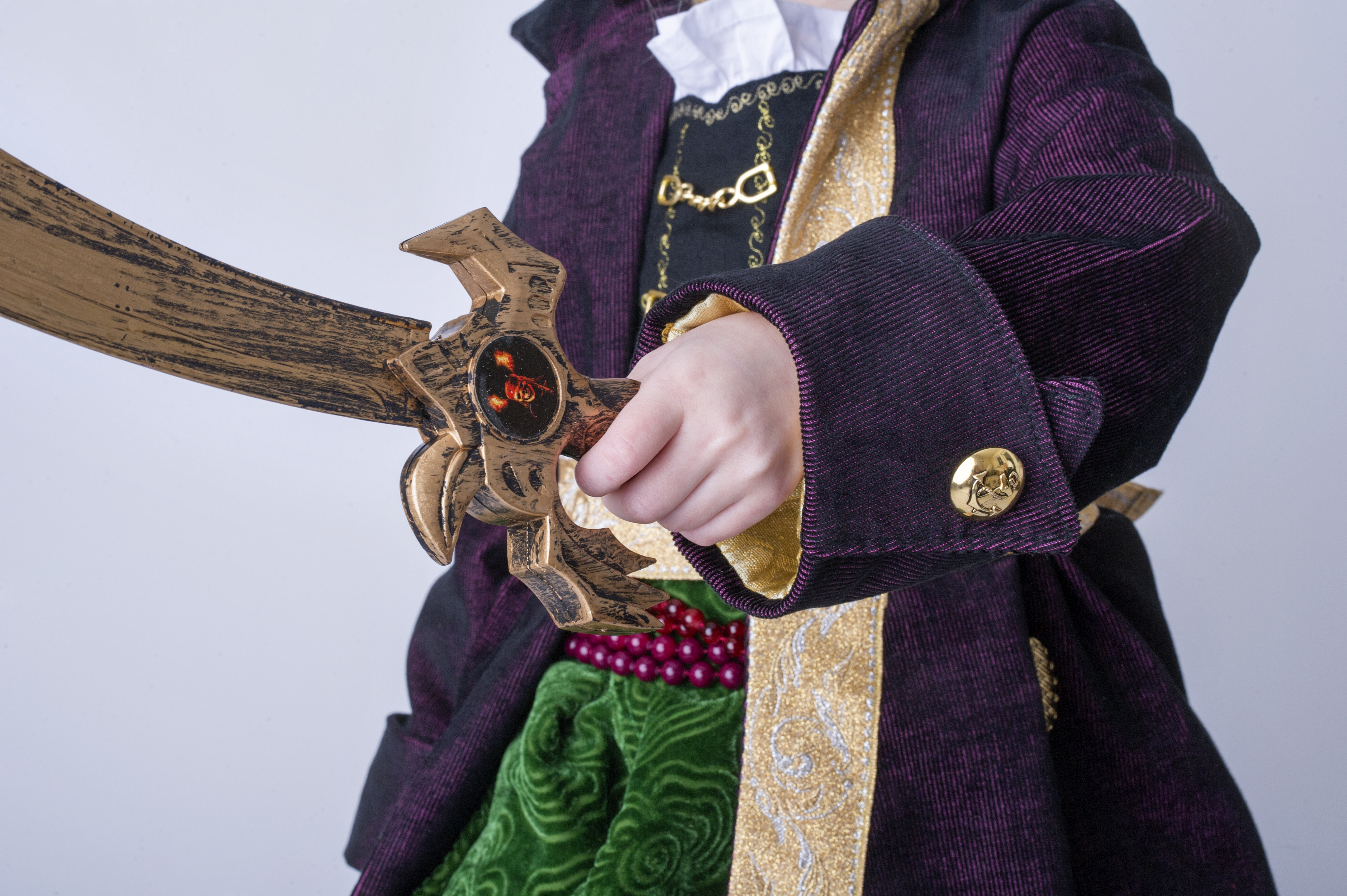 Zoveel accessoires zijn er niet, dus daar kan ik kort en bondig over zijn. Een paars stukje tricot werd al snel een haarband, 2 halskettingen van Veritas die net gepast twee maal rond de taille van de dochter kunnen, dienen als riem en de sabel mochten we even lenen van een gul vriendje.