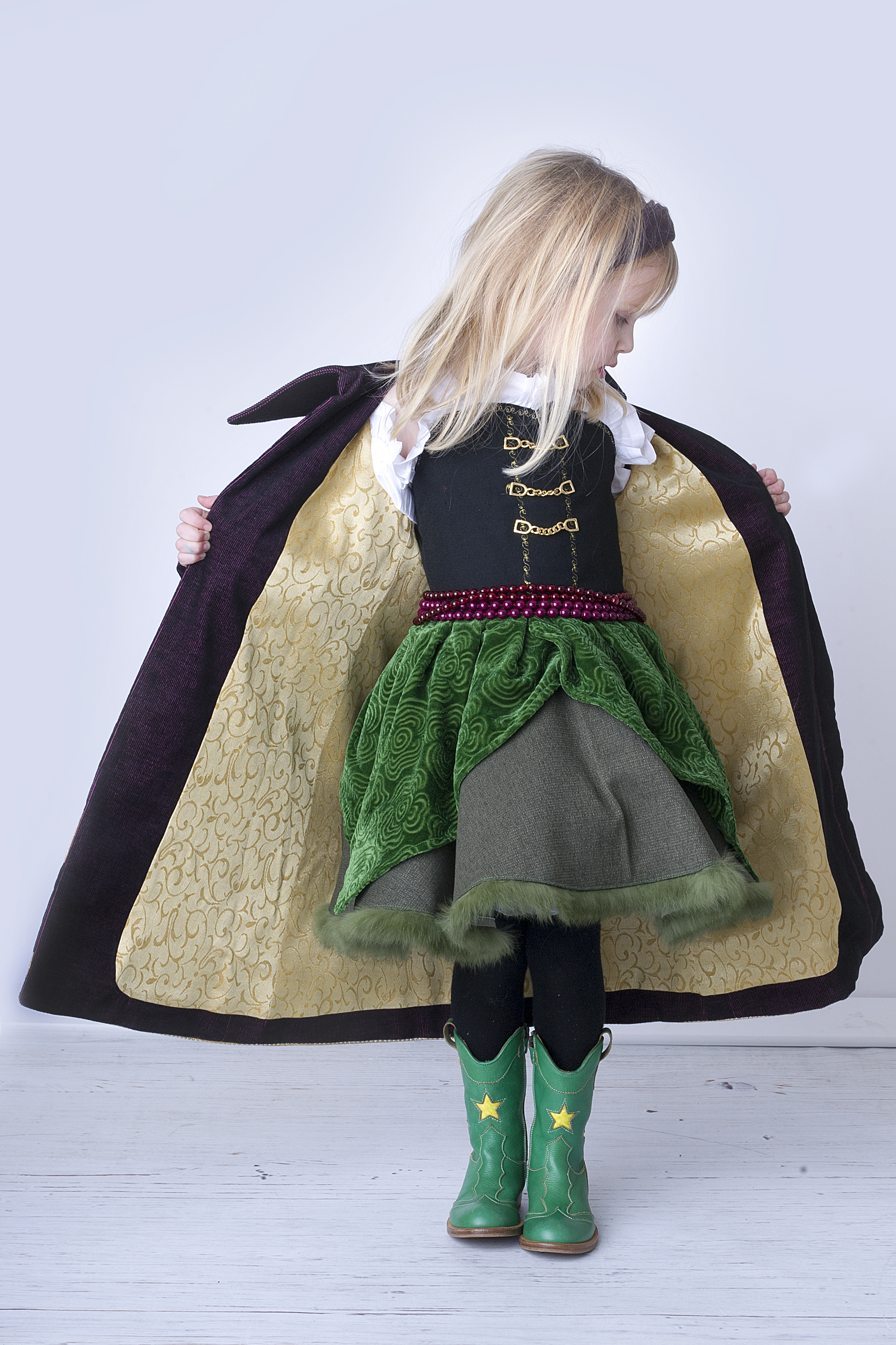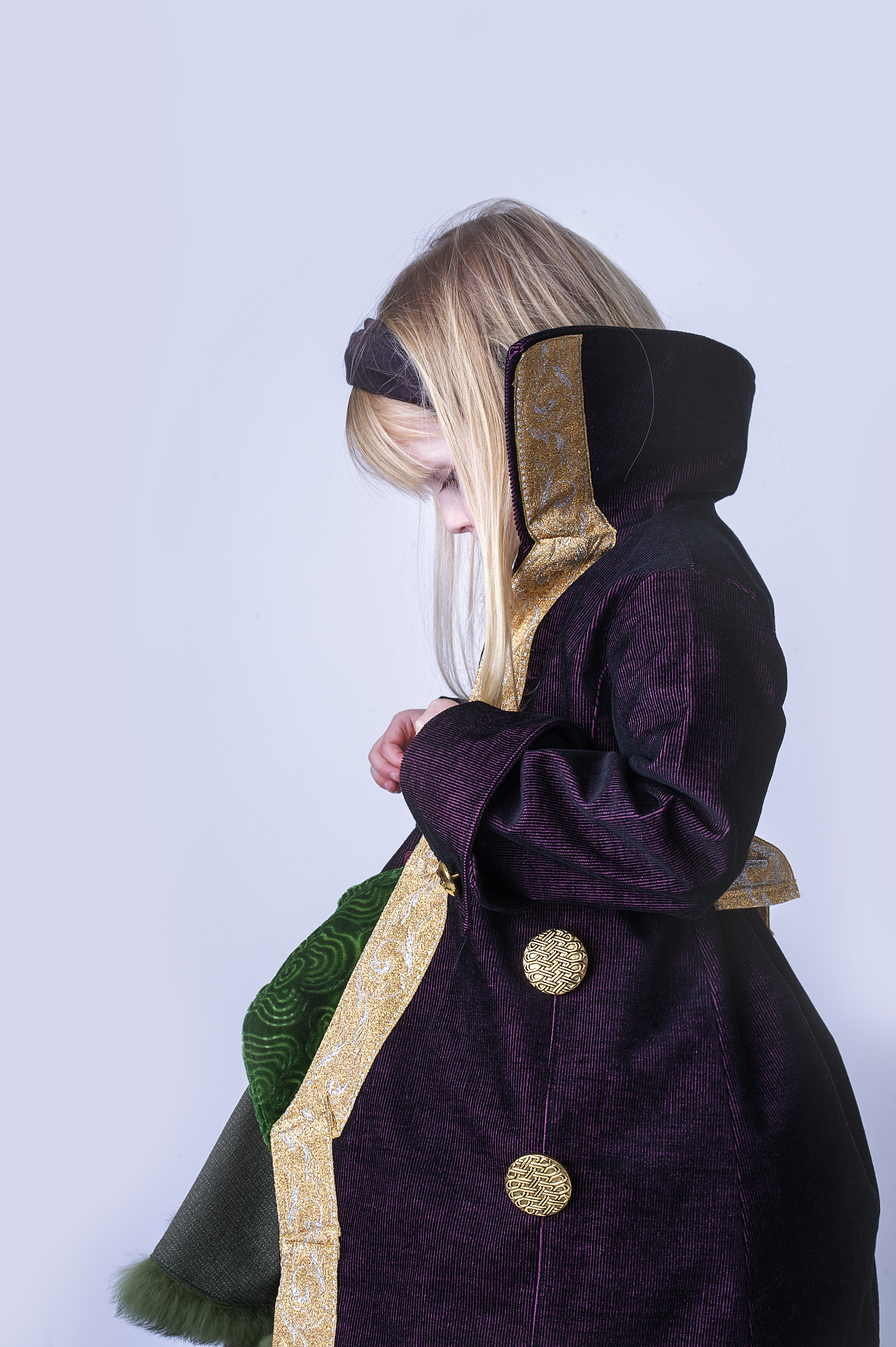 De jurk tekende ik volledig zelf, maar voor de mantel deed ik als basis toch beroep op een bestaand patroon, namelijk het Jackie manteltje van Ienemiene en Emma en Mona. Ik verlengde maat  110 met 20cm, hertekende het linkervoorpand, de kraag en de mouwen. De stof is een stevige ribfluweel, donkerpaars met een zwarte ondertoon, van bij Mertens te Melle. Ook de fournituren vond ik daar. Voor de voering gebruikte ik een soepele goudkleurige stof die ik vond in de Strik in Ledeberg.