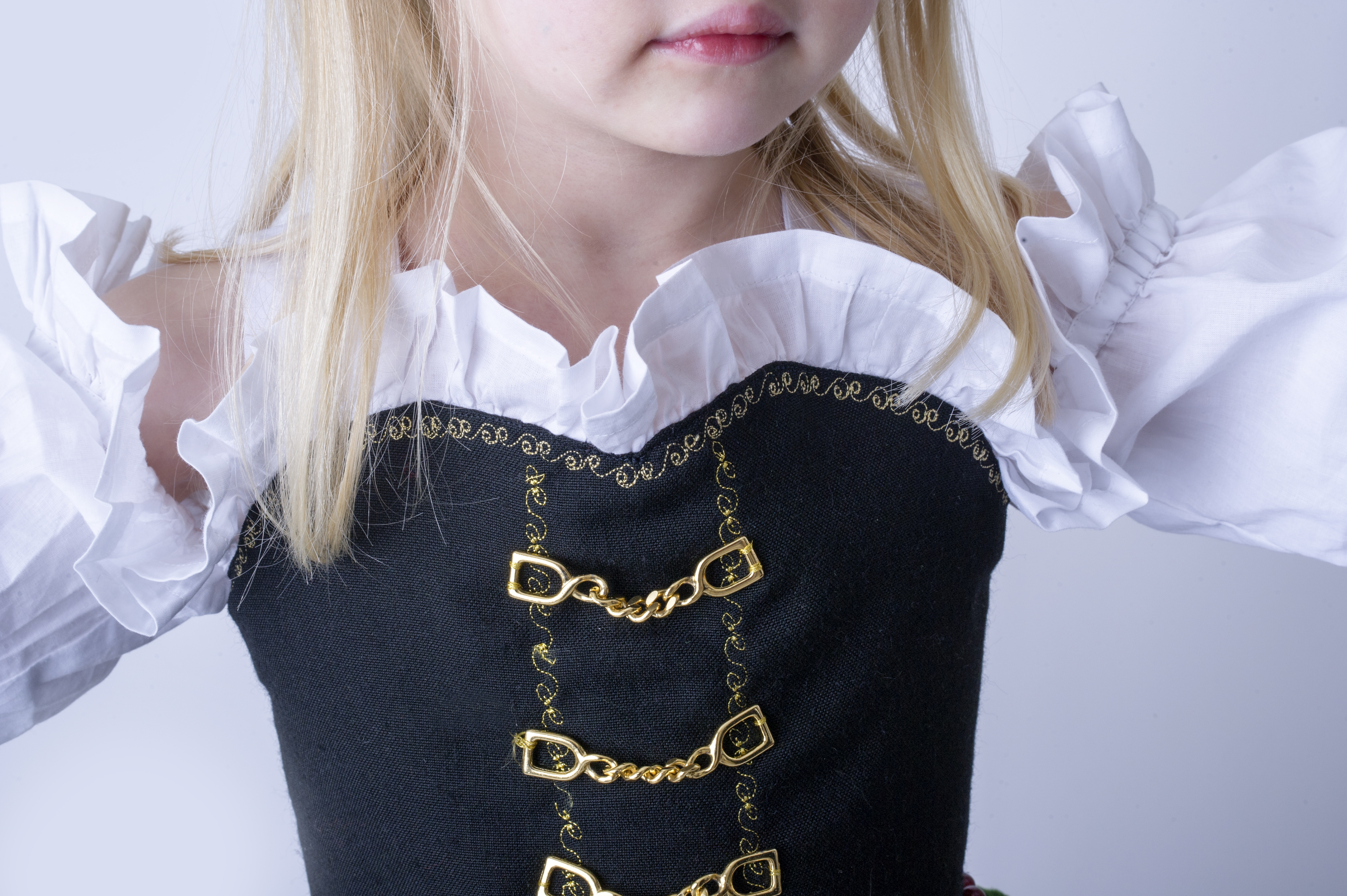 Zarina draagt een schouderloos wit bloesje. Mooi, maar totaal niet praktisch voor een kind waarbij van rondingen nog geen sprake is. Ik koos voor een basistopje, volledig gevoerd, met daaraan bevestigd pofmouwtjes met een open schouder. Bovenaan werd rondom een strook witte katoen bevestigd, die ik al gerimpeld had. Het stuk waar deze gerimpelde strook aan de mouw is bevestigd, heeft een ‘tunnel’, waar een elastiek doorloopt. Ik knipte nogmaals voor- en achterpanden, maar zonder de schouderbandjes en deze keer in het zwart. Dat geheel werd geassembleerd, voorzien van wat bling bling en bovenop het bovenstukje gestikt. Mét een gouden sierstiksel, want jawel, sedert een week ben ik de trotse eigenaar van een Bernina 350! Kon er een idealer ogenblik zijn die uit te testen?! (Hoe het geheel uiteindelijk in elkaar steekt, daar gingen heel wat uren denk- en puzzelwerk aan te pas. Laat gerust in een commentaartje weten of een tutorial gewenst zou zijn, dan maak ik er eens werk van.)