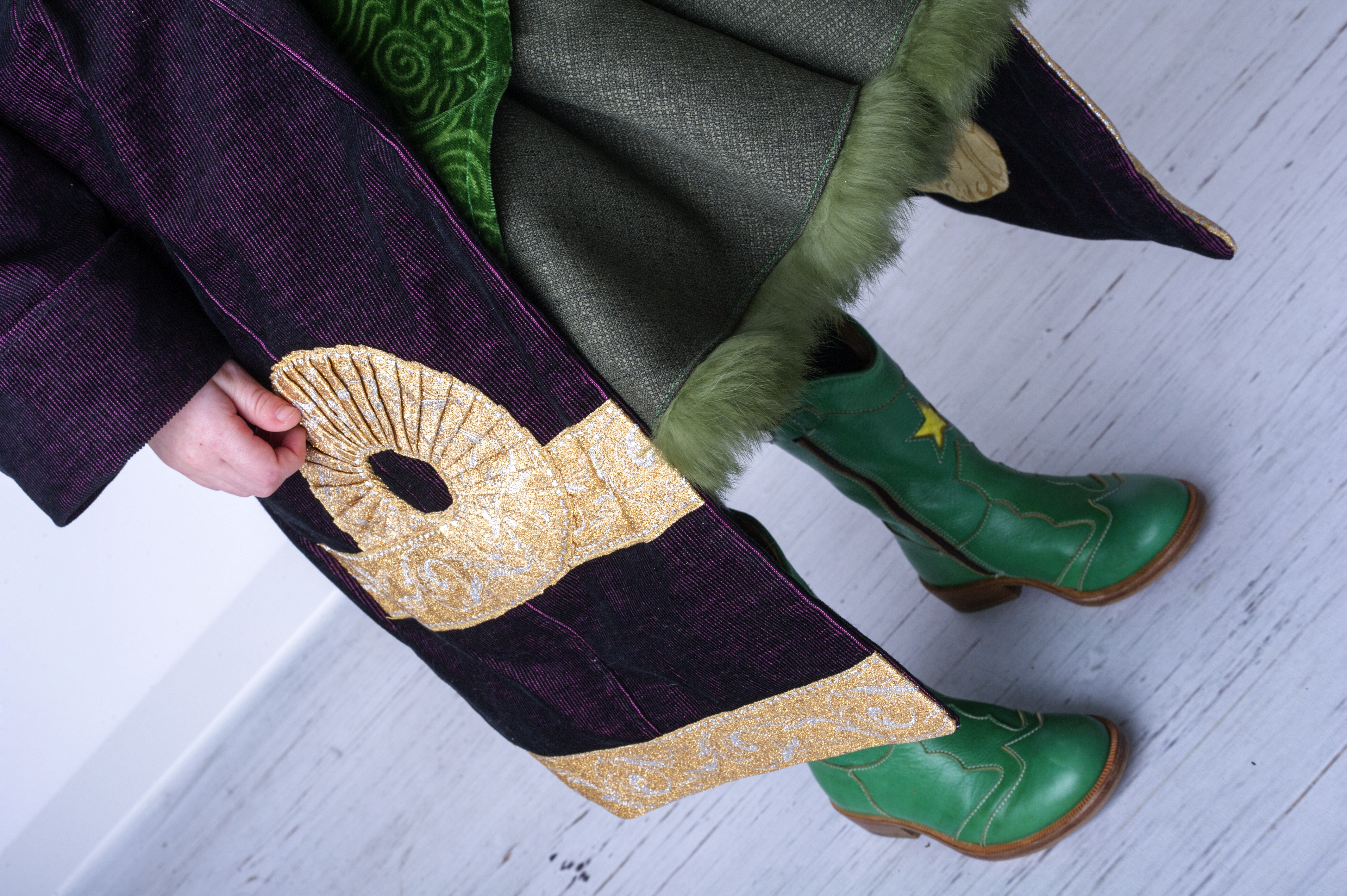 De rok bestaat uit 2 delen. Een losse onderrok uit tule met daarboven een cirkelrok uit een donkergroene wolmix, aan de zoom afgewerkt met een groen bontje. Bovenop de cirkelrok stikte ik twee ‘bloemblaadjes’ van een zachte, groene stof met bloemendessin. Ik paste ongeveer dezelfde methode toe als bij deze broche. Achteraan sluit de jurk met een zichtbare rits.