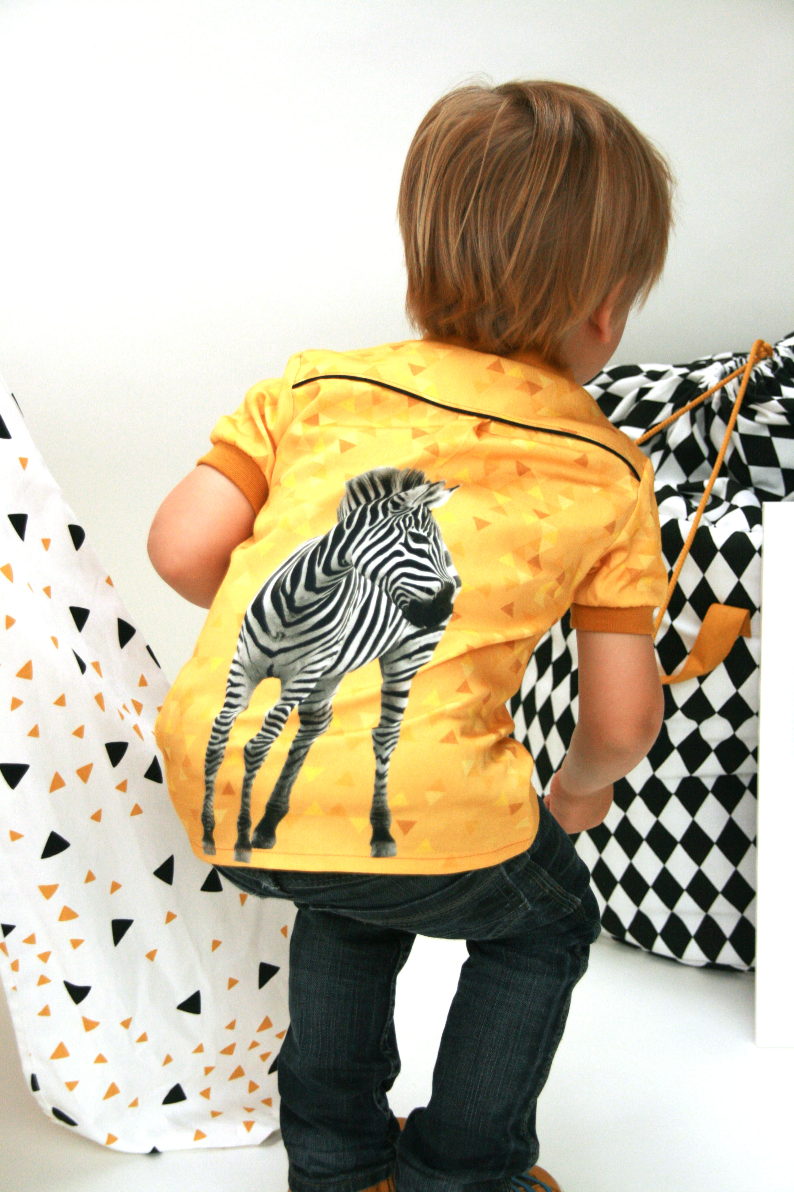 Bambiblauw heeft een nieuwe lading panelen laten drukken, hurray! Ze zijn zo mogelijk nog mooier dan de eerste lading én deze keer ook verkrijgbaar in tricot! De zoon mocht kiezen welke er onze richting uitkwam voor een test en opteerde voor de zebra. De tricotversie was al aan iemand beloofd dus gingen we aan de slag met het katoentje. Hij kreeg een Theo van Zonen09 -hoe kan het ook anders-, maar met rits deze keer, volgens deze handleiding. Een aanrader trouwens! Ik gebruikte mosterdgele boordstof aan de mouwen en voor de bovenkant van de kraag en een zwarte paspel in het borstzakje en op de rug.