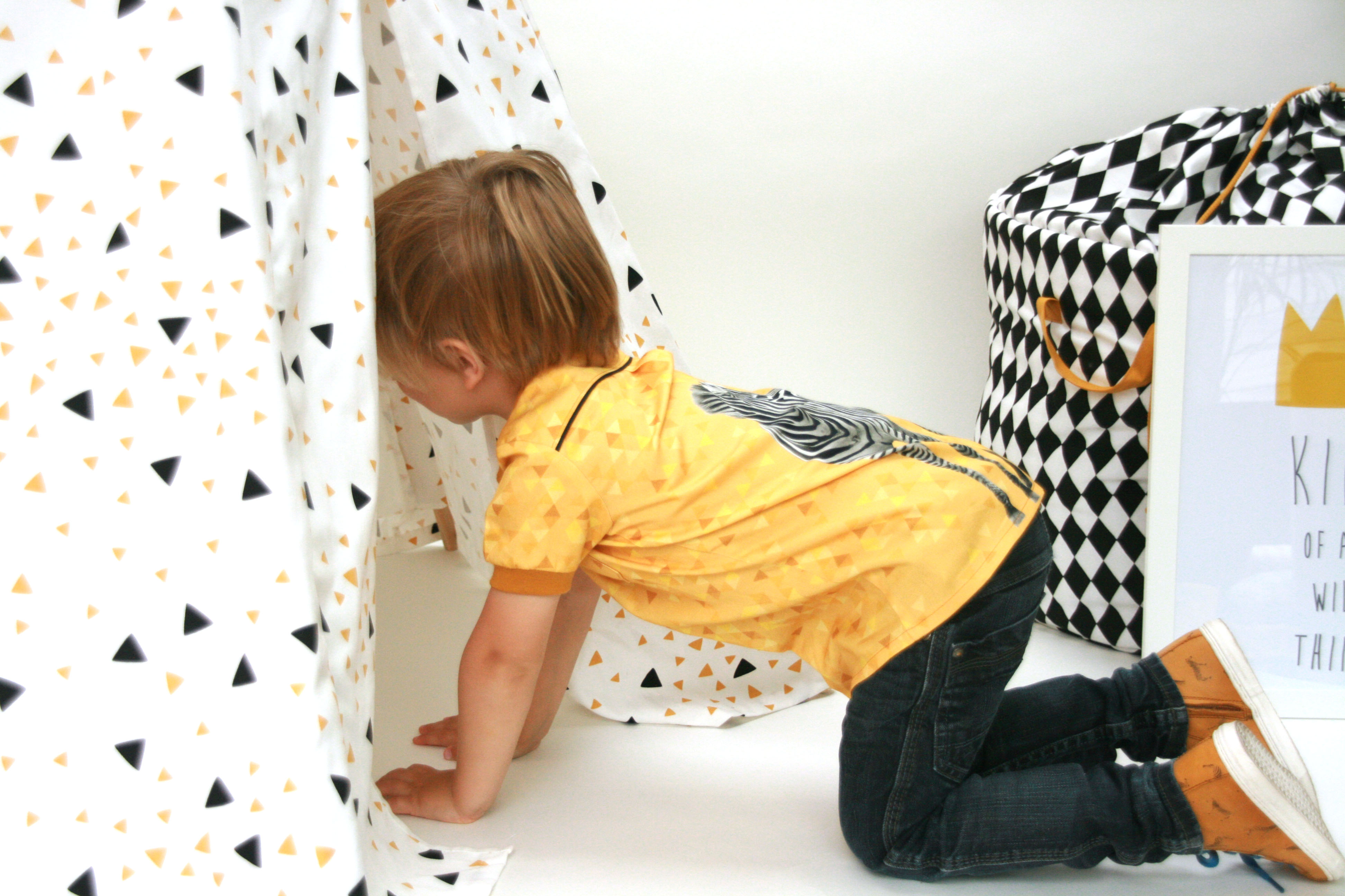 Zwart, wit en mosterdgeel of oker. Modekleuren van het moment en ook hier in huis ben ik er al voor gezwicht. Moeilijk was het dan ook niet om een leuke setting te creëren voor de fotoshoot. Kijk die tipi en speelgoedopbergzak (echt, zoveel leuker om te zien staan dan curverbakken!) van het merk Nobodinoz, alsof ze voor elkaar bestemd zijn. En dan zijn schoenen, man, die schoenen! Er staan zowaar kleine zebraatjes op.