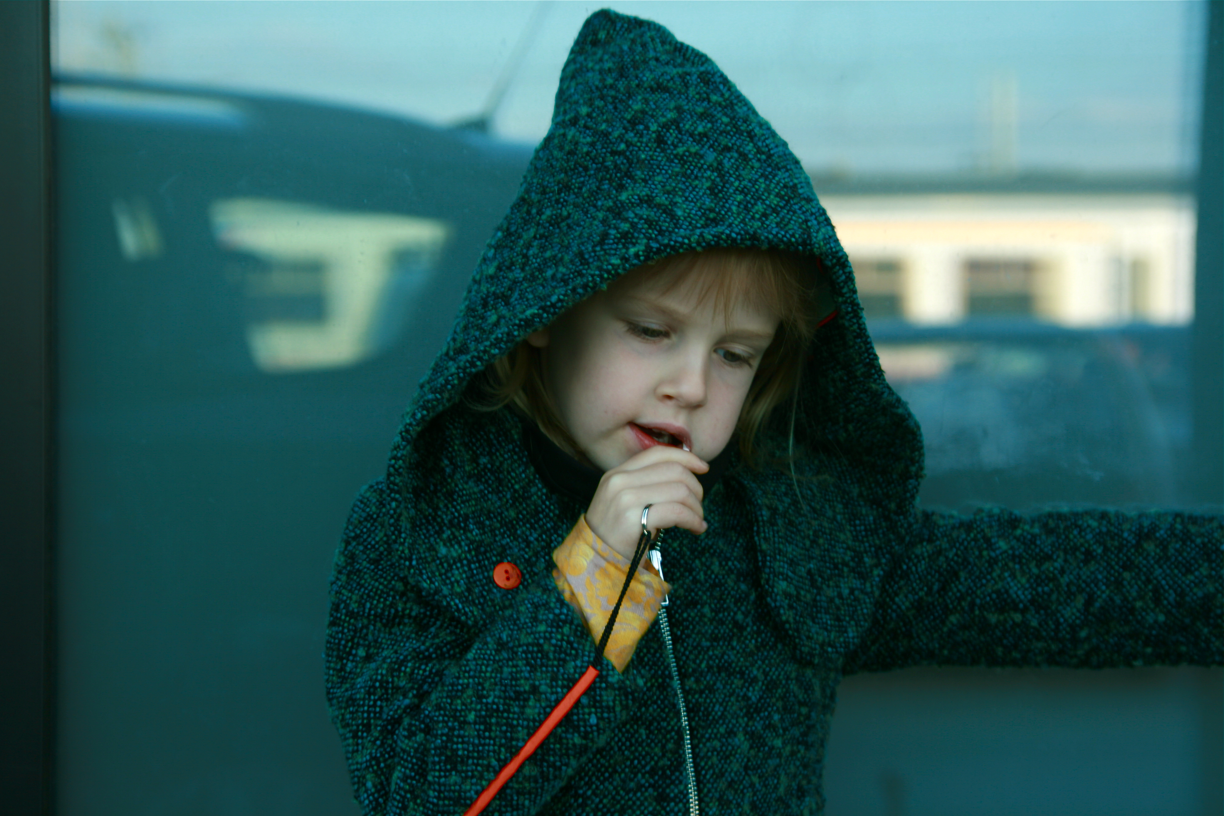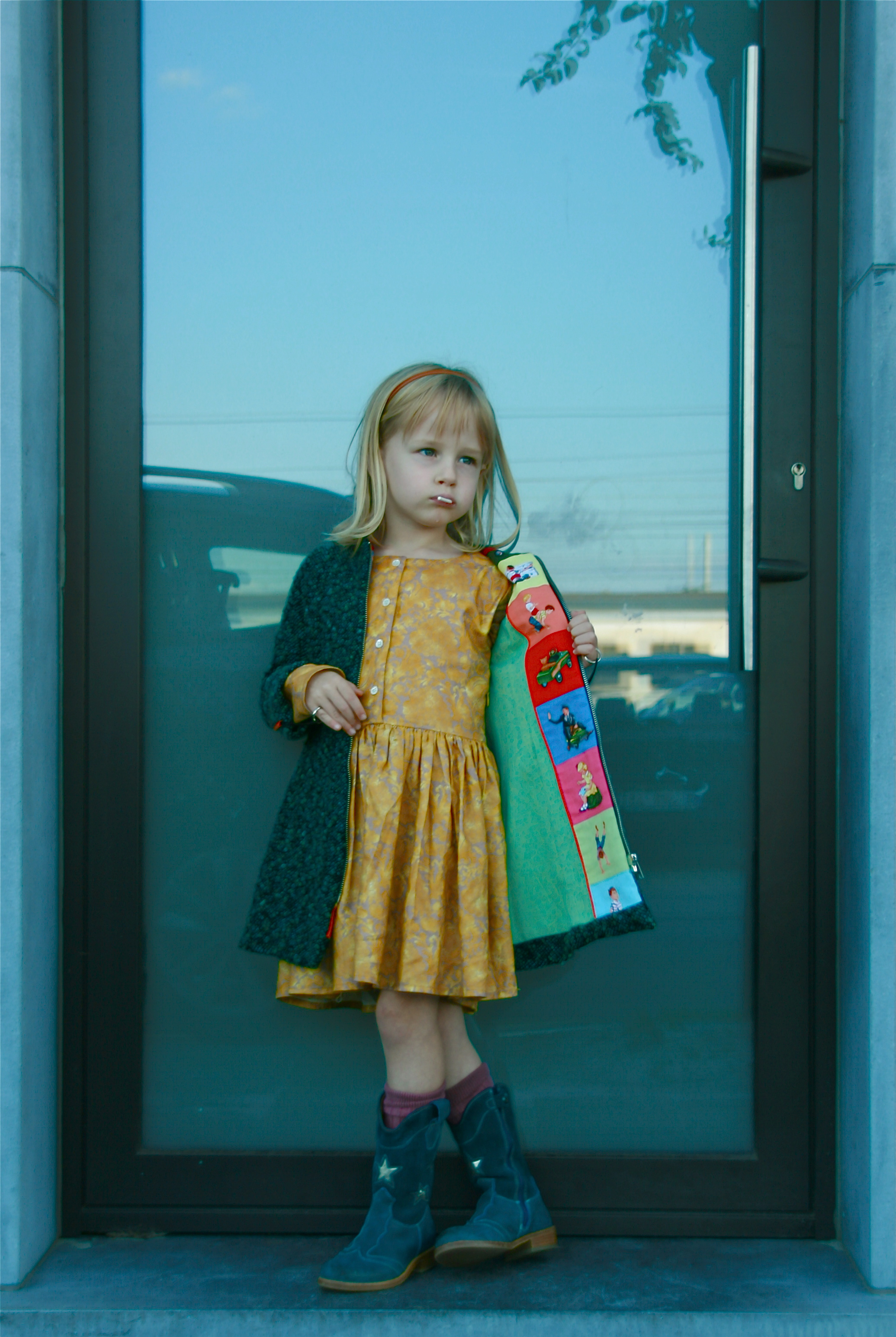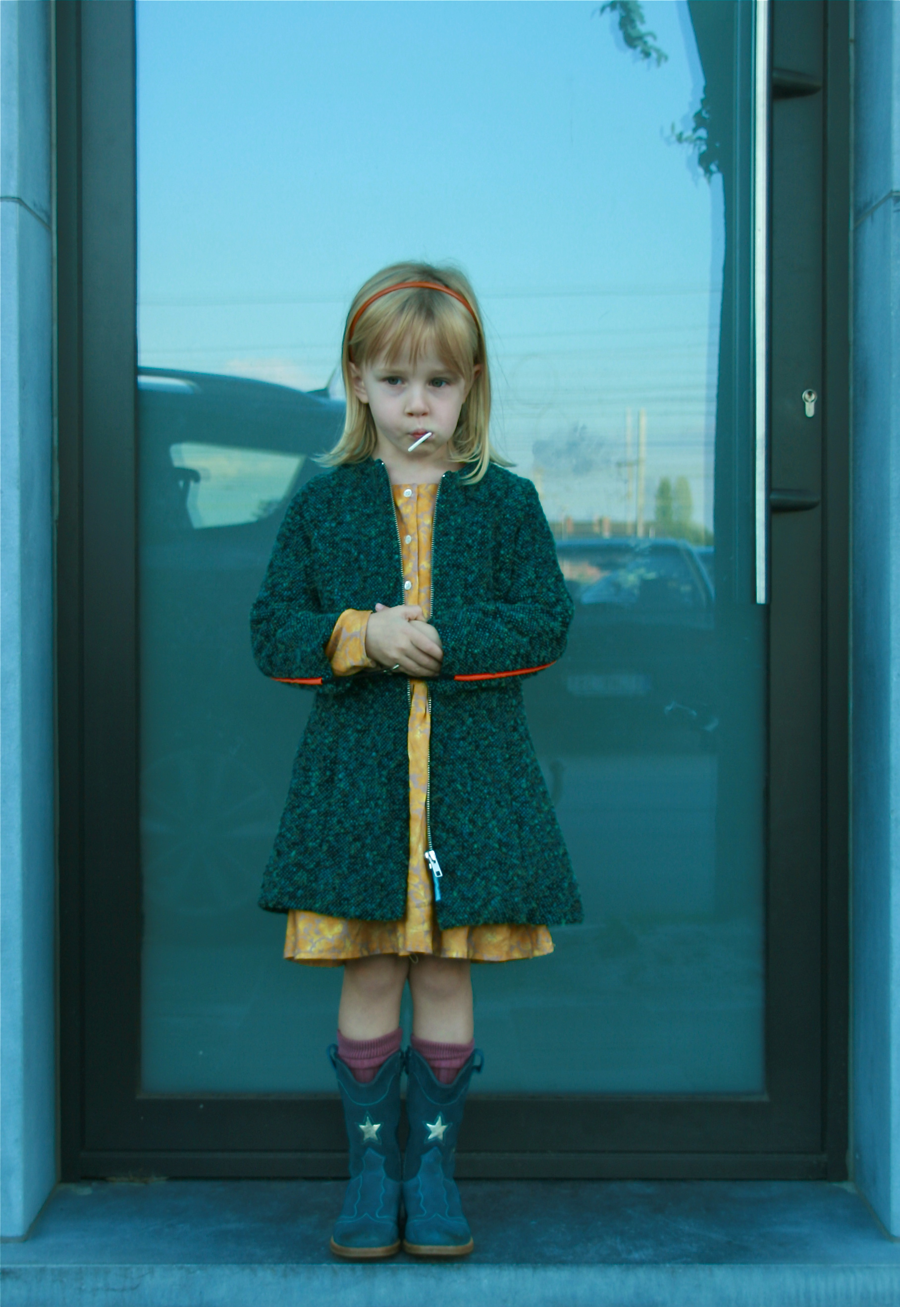Ik merkte op dat hij eerder breed viel en de mouwen aan de korte kant waren, dus in de definitieve jas werden de mouwen 2cm langer gemaakt en de boordstof ook 2 cm. Aan de breedte werd niet gesleuteld, want in tegenstelling tot de -lichte- testjas, is de uiteindelijke versie een voor putje winter: de buitenstof is heel stevige, waterdicht gemaakte sweaterstof, de voeringstof is crème-kleurige fleece (100% katoen) en daartussen propte ik nog 2 lagen wattine. Koud zal ze niet hebben, vermoed ik. Voor de kraag gebruikte ik een stukje nepbont. Eerlijk is eerlijk, hier haalde ik de mosterd -ik vind dit nog steeds een van de mooiste jassen die ik ooit gezien heb- en ik wou al lang deze ook eens maken.