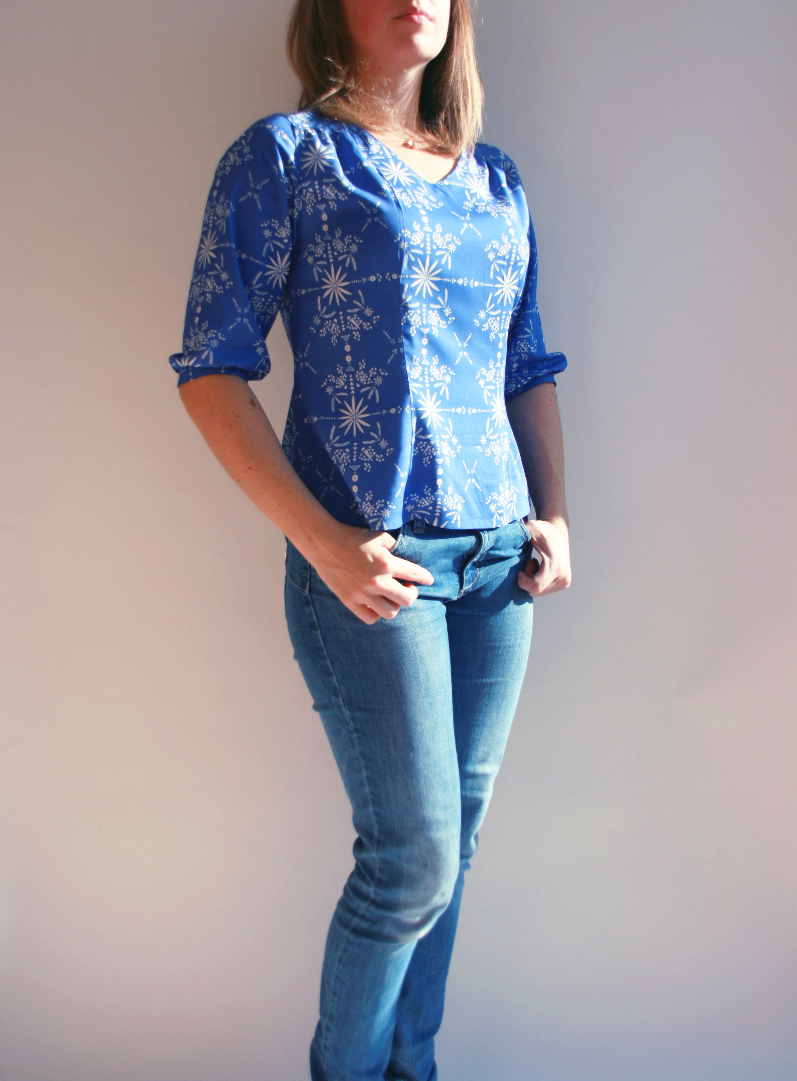 Ik keek rond en ik vond… een blauwe viscosestof van Cotton + Steel. Het is al een tijdje geleden dat ik nog iets voor mezelf gemaakt heb, maar deze stof is me op het lijf geschreven. Ze valt soepel, heeft een mooie diepblauwe kleur en verwerkt heel gemakkelijk. Het patroon is de ‘Airelle Blouse‘ van het Franse Deer & Doe. Wat ik ook maak van hen, het past me altijd recht uit het boekje, geen aanpassingen nodig. Zo heb ik het graag!