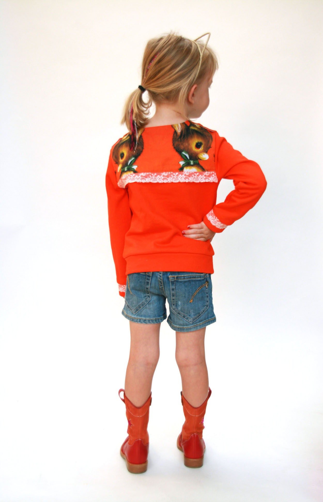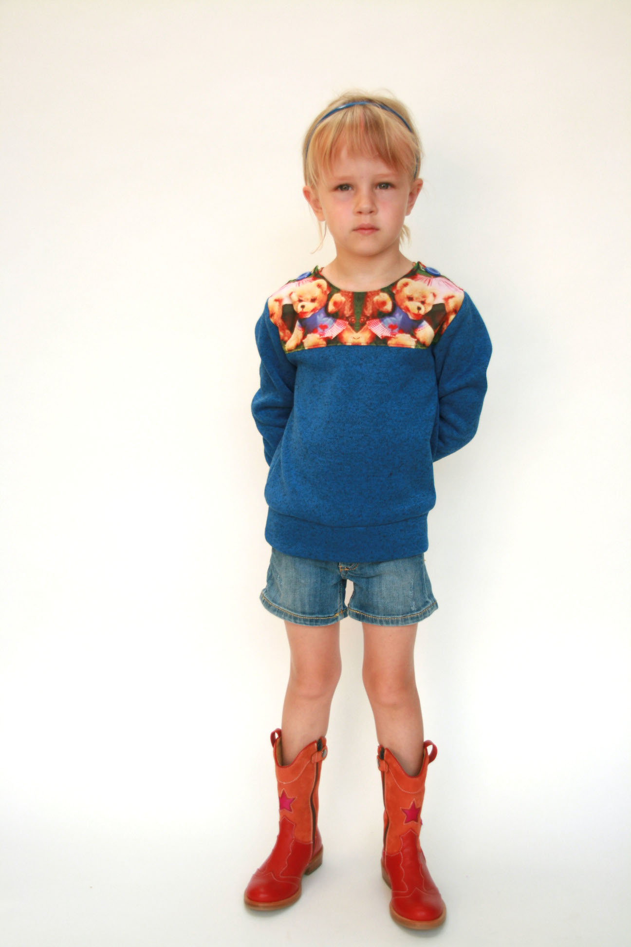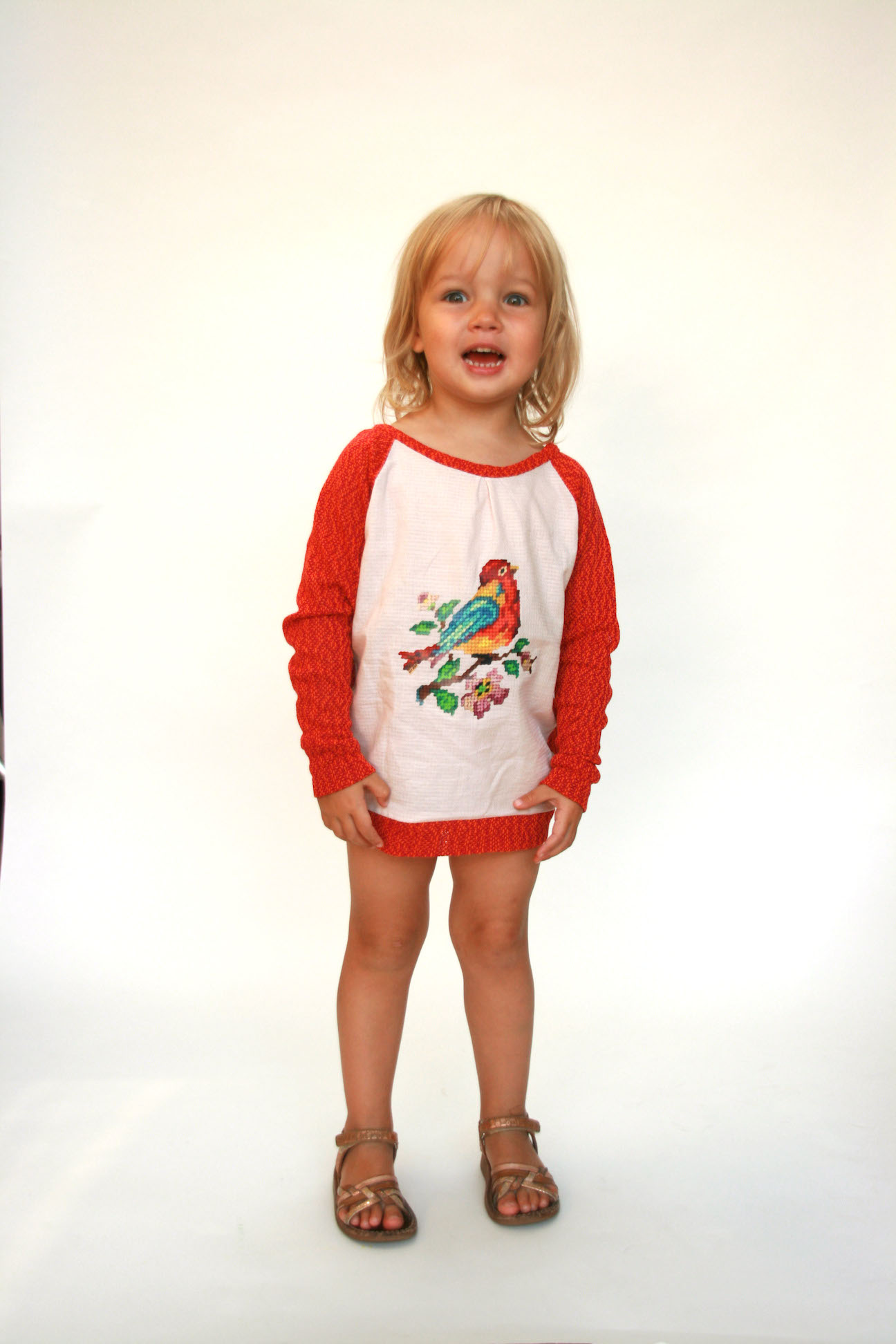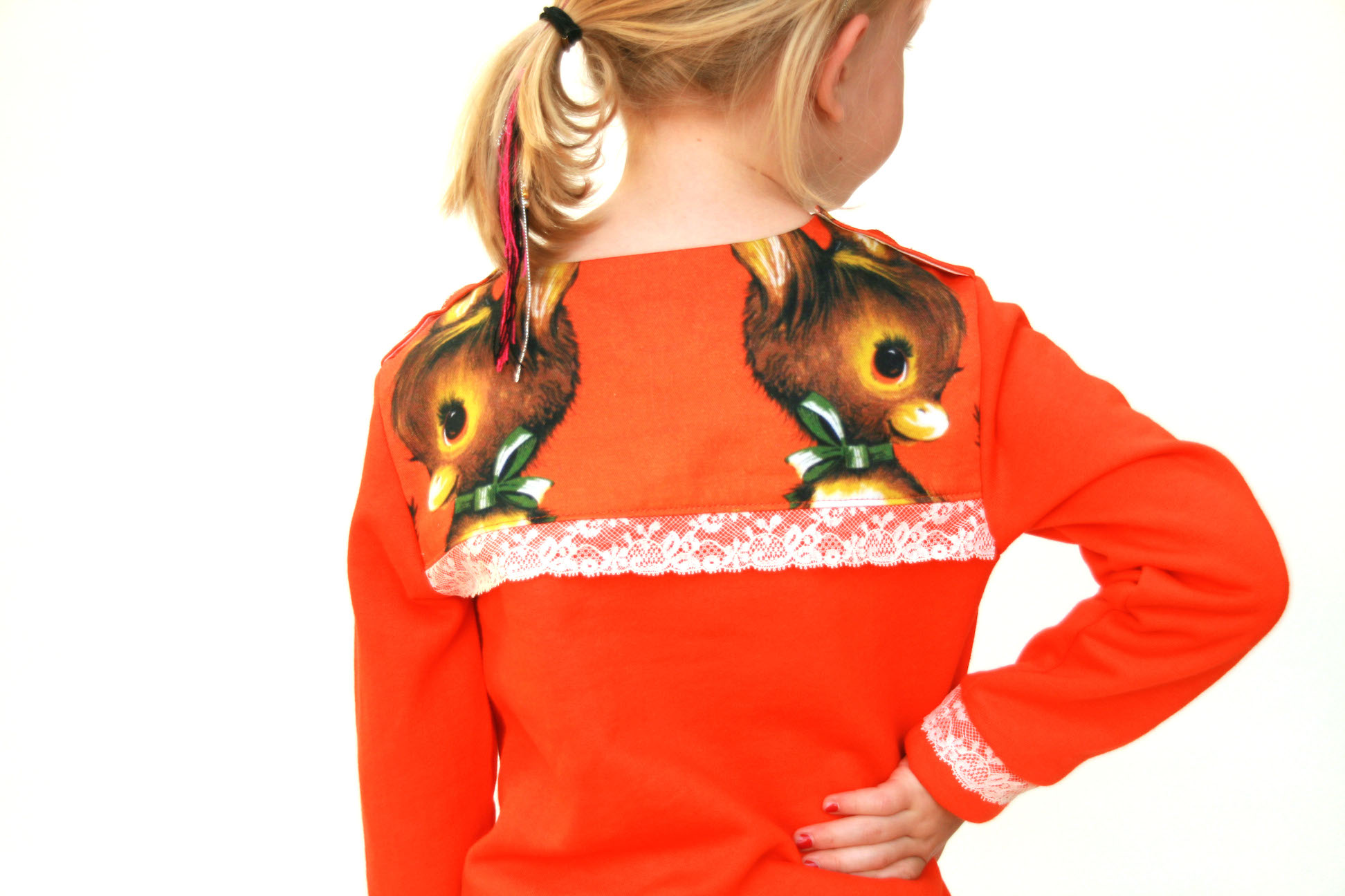 Maar eerlijk, who cares? Ik ben nog steeds verzot op de stof, het model en het kind erin. Ik geniet ook nog even na van het feit dat ik mijn duurste en meest impulsieve stoffenaankoop ooit van de vuilbak heb gered. Ik hou van de mooie knopenrij op de rug, van de gestikte nepen op voor- en achterpand en hoe de stof zo mooi openvalt eronder. Ik speelde ook wat met mijn overlock om de zoom onderaan af te werken met een rode rolzoom. Kwestie van het niet saai te houden zeker. En die halslijn? Ach, daar steken we wel een colleke onder als het te koud wordt.