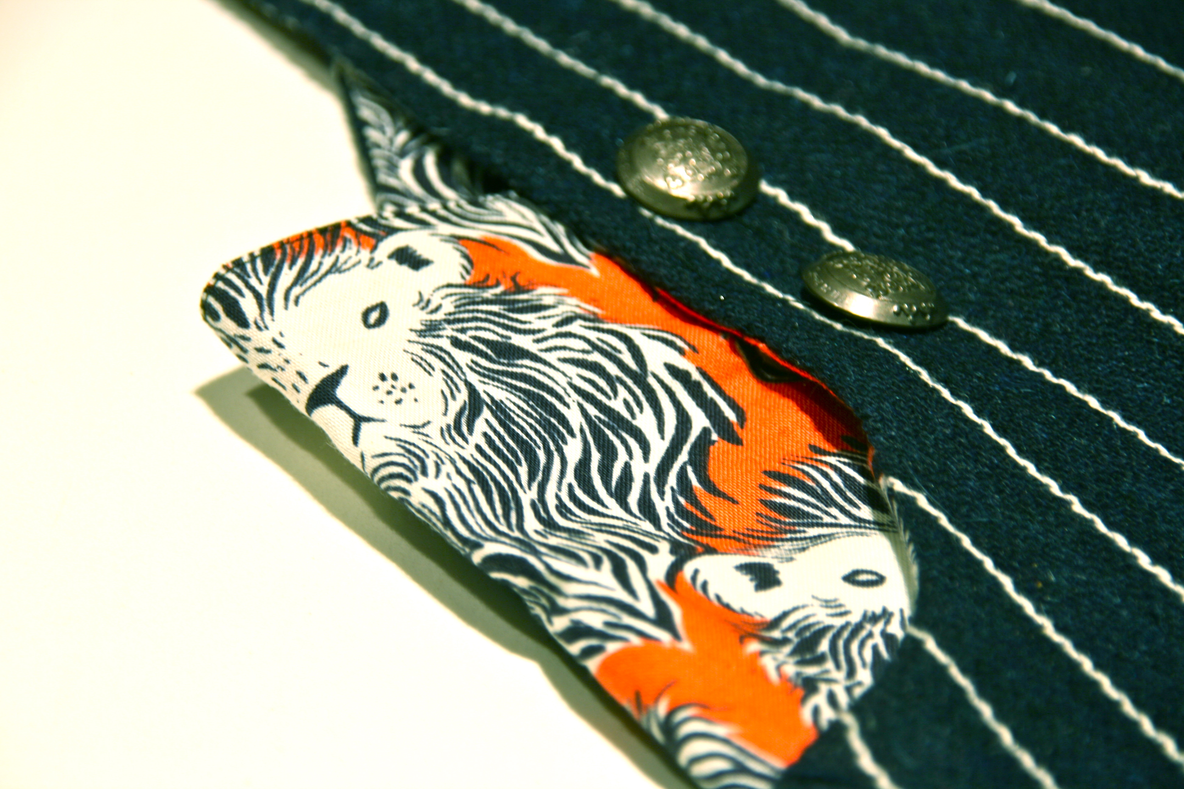 Here’s what I came up with: a navy blue white striped woolmix combined with a lion print from cotton+steel. The latter actually being an incorrectly supplied etsy order. I was going for the chamois, but I got the lions instead. And apparently, I’m not the first that got hold of this fabric by accident. It’s haunted, I think. One look at it and it’s coming your way. You guys, forewarned is forearmed!